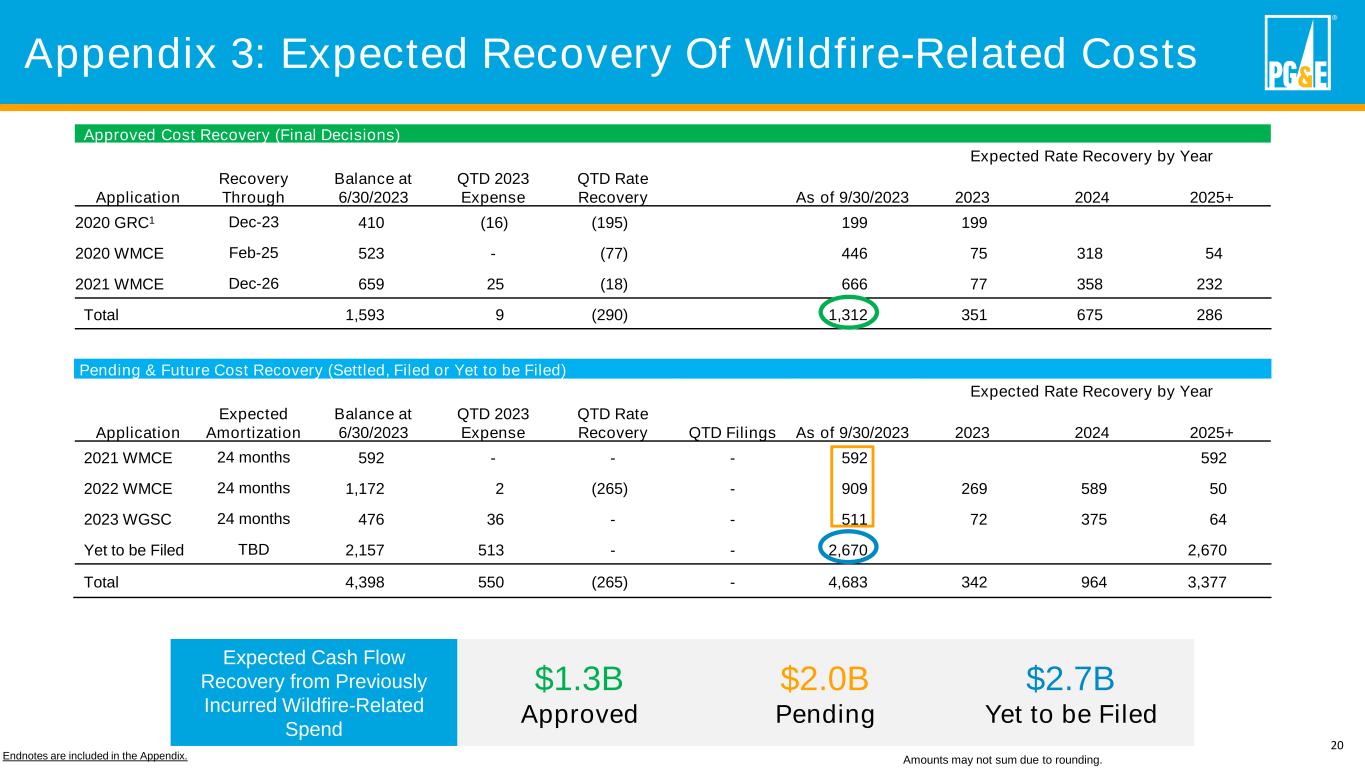 20 Endnotes are included in the Appendix. Appendix 3: Expected Recovery Of Wildfire-Related Costs Amounts may not sum due to rounding. Expected Cash Flow Recovery from Previously Incurred Wildfire-Related Spend $1.3B Approved $2.0B Pending $2.7B Yet to be Filed Approved Cost Recovery (Final Decisions) Expected Rate Recovery by Year Application Recovery Through Balance at 6/30/2023 QTD 2023 Expense QTD Rate Recovery As of 9/30/2023 2023 2024 2025+ 2020 GRC1 Dec-23 410 (16) (195) 199 199 2020 WMCE Feb-25 523 - (77) 446 75 318 54 2021 WMCE Dec-26 659 25 (18) 666 77 358 232 Total 1,593 9 (290) 1,312 351 675 286 Pending & Future Cost Recovery (Settled, Filed or Yet to be Filed) Expected Rate Recovery by Year Application Expected Amortization Balance at 6/30/2023 QTD 2023 Expense QTD Rate Recovery QTD Filings As of 9/30/2023 2023 2024 2025+ 2021 WMCE 24 months 592 - - - 592 592 2022 WMCE 24 months 1,172 2 (265) - 909 269 589 50 2023 WGSC 24 months 476 36 - - 511 72 375 64 Yet to be Filed TBD 2,157 513 - - 2,670 2,670 Total 4,398 550 (265) - 4,683 342 964 3,377