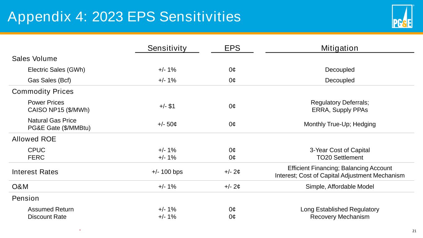 21 Sensitivity EPS Mitigation Sales Volume Electric Sales (GWh) +/- 1% 0¢ Decoupled Gas Sales (Bcf) +/- 1% 0¢ Decoupled Commodity Prices Power Prices CAISO NP15 ($/MWh) +/- $1 0¢ Regulatory Deferrals; ERRA, Supply PPAs Natural Gas Price PG&E Gate ($/MMBtu) +/- 50¢ 0¢ Monthly True-Up; Hedging Allowed ROE CPUC FERC +/- 1% +/- 1% 0¢ 0¢ 3-Year Cost of Capital TO20 Settlement Interest Rates +/- 100 bps +/- 2¢ Efficient Financing; Balancing Account Interest; Cost of Capital Adjustment Mechanism O&M +/- 1% +/- 2¢ Simple, Affordable Model Pension Assumed Return Discount Rate +/- 1% +/- 1% 0¢ 0¢ Long Established Regulatory Recovery Mechanism Appendix 4: 2023 EPS Sensitivities