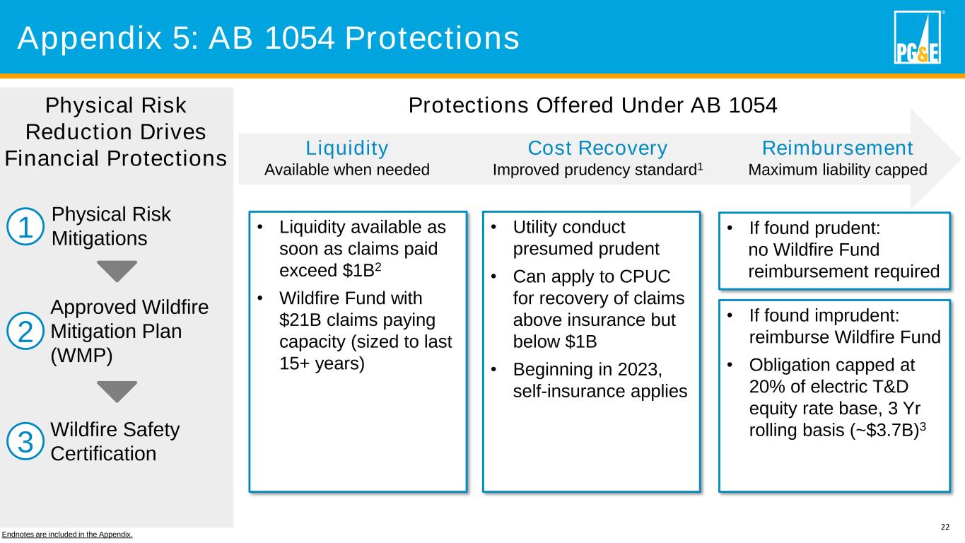 22 Endnotes are included in the Appendix. Protections Offered Under AB 1054 Appendix 5: AB 1054 Protections Physical Risk Reduction Drives Financial Protections • Liquidity available as soon as claims paid exceed $1B2 • Wildfire Fund with $21B claims paying capacity (sized to last 15+ years) Liquidity Available when needed Cost Recovery Improved prudency standard1 Reimbursement Maximum liability capped • Utility conduct presumed prudent • Can apply to CPUC for recovery of claims above insurance but below $1B • Beginning in 2023, self-insurance applies • If found imprudent: reimburse Wildfire Fund • Obligation capped at 20% of electric T&D equity rate base, 3 Yr rolling basis (~$3.7B)3 • If found prudent: no Wildfire Fund reimbursement required Physical Risk Mitigations1 Approved Wildfire Mitigation Plan (WMP) 2 Wildfire Safety Certification3
