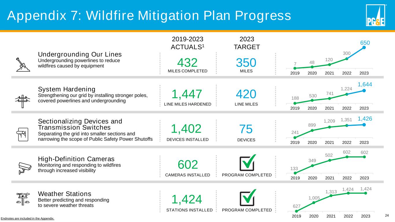 24 Endnotes are included in the Appendix. Appendix 7: Wildfire Mitigation Plan Progress Undergrounding Our Lines Undergrounding powerlines to reduce wildfires caused by equipment System Hardening Strengthening our grid by installing stronger poles, covered powerlines and undergrounding Sectionalizing Devices and Transmission Switches Separating the grid into smaller sections and narrowing the scope of Public Safety Power Shutoffs High-Definition Cameras Monitoring and responding to wildfires through increased visibility Weather Stations Better predicting and responding to severe weather threats 2019 2020 2021 2022 2023 7 48 120 300 650 2019 2020 2021 2022 2023 188 530 741 1,224 1,644 2019 2020 2021 2022 2023 241 899 1,209 1,351 1,426 2019 2020 2021 2022 2023 133 349 502 602 602 2019 2020 2021 2022 2023 627 1,005 1,313 1,424 1,424 2019-2023 ACTUALS1 STATIONS INSTALLED 1,424 CAMERAS INSTALLED 602 DEVICES INSTALLED 1,402 LINE MILES HARDENED 1,447 MILES COMPLETED 432 2023 TARGET DEVICES 75 MILES 350 LINE MILES 420 PROGRAM COMPLETED PROGRAM COMPLETED