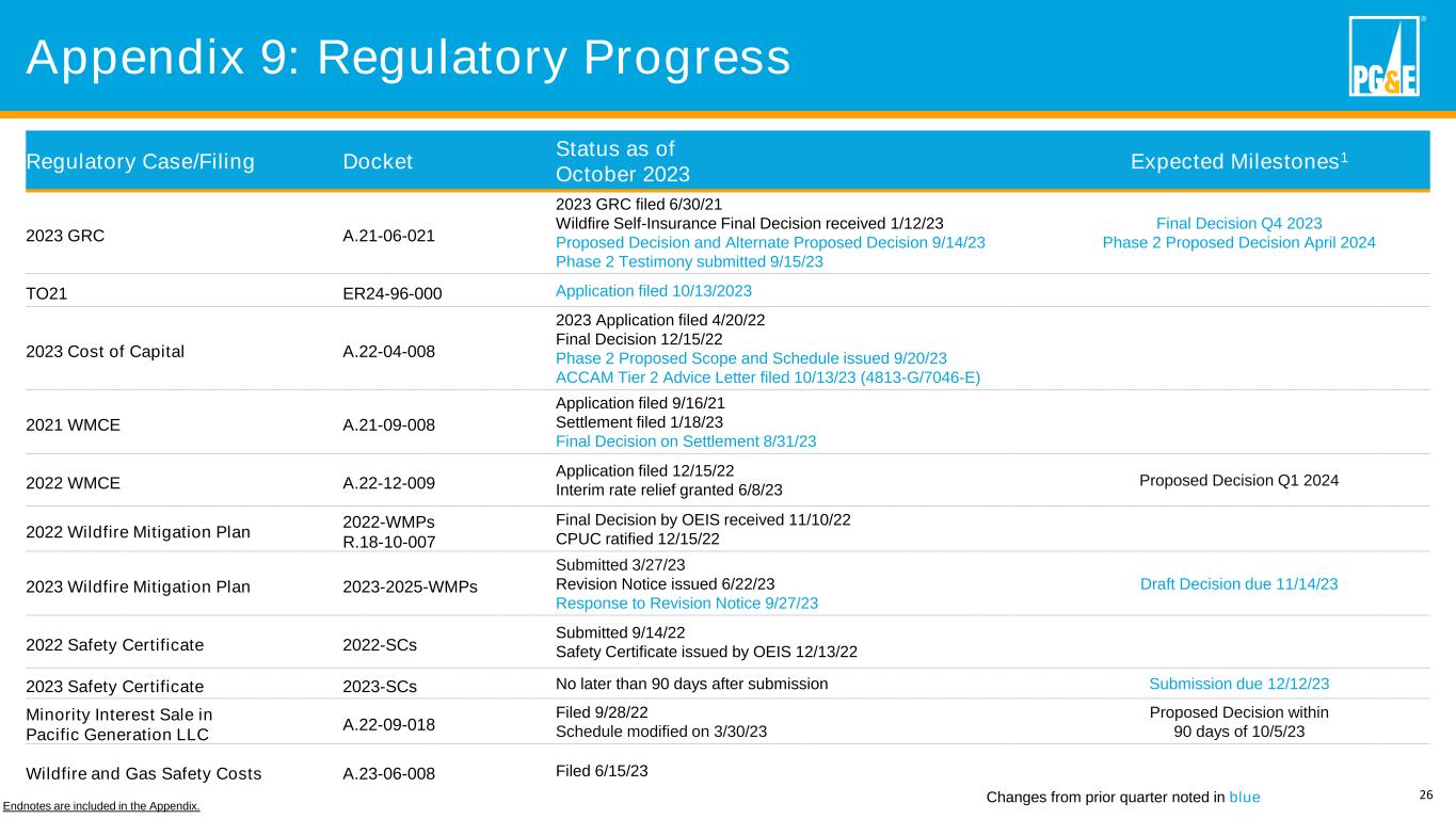 26 Endnotes are included in the Appendix. Changes from prior quarter noted in blue Regulatory Case/Filing Docket Status as of October 2023 Expected Milestones1 2023 GRC A.21-06-021 2023 GRC filed 6/30/21 Wildfire Self-Insurance Final Decision received 1/12/23 Proposed Decision and Alternate Proposed Decision 9/14/23 Phase 2 Testimony submitted 9/15/23 Final Decision Q4 2023 Phase 2 Proposed Decision April 2024 TO21 ER24-96-000 Application filed 10/13/2023 2023 Cost of Capital A.22-04-008 2023 Application filed 4/20/22 Final Decision 12/15/22 Phase 2 Proposed Scope and Schedule issued 9/20/23 ACCAM Tier 2 Advice Letter filed 10/13/23 (4813-G/7046-E) 2021 WMCE A.21-09-008 Application filed 9/16/21 Settlement filed 1/18/23 Final Decision on Settlement 8/31/23 2022 WMCE A.22-12-009 Application filed 12/15/22 Interim rate relief granted 6/8/23 Proposed Decision Q1 2024 2022 Wildfire Mitigation Plan 2022-WMPs R.18-10-007 Final Decision by OEIS received 11/10/22 CPUC ratified 12/15/22 2023 Wildfire Mitigation Plan 2023-2025-WMPs Submitted 3/27/23 Revision Notice issued 6/22/23 Response to Revision Notice 9/27/23 Draft Decision due 11/14/23 2022 Safety Certificate 2022-SCs Submitted 9/14/22 Safety Certificate issued by OEIS 12/13/22 2023 Safety Certificate 2023-SCs No later than 90 days after submission Submission due 12/12/23 Minority Interest Sale in Pacific Generation LLC A.22-09-018 Filed 9/28/22 Schedule modified on 3/30/23 Proposed Decision within 90 days of 10/5/23 Wildfire and Gas Safety Costs A.23-06-008 Filed 6/15/23 Appendix 9: Regulatory Progress