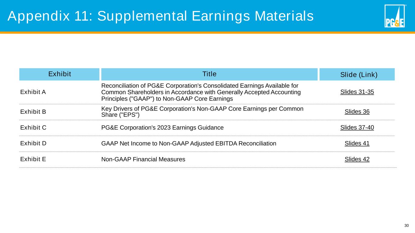 30 Appendix 11: Supplemental Earnings Materials Exhibit Title Slide (Link) Exhibit A Reconciliation of PG&E Corporation's Consolidated Earnings Available for Common Shareholders in Accordance with Generally Accepted Accounting Principles ("GAAP") to Non-GAAP Core Earnings Slides 31-35 Exhibit B Key Drivers of PG&E Corporation's Non-GAAP Core Earnings per Common Share ("EPS") Slides 36 Exhibit C PG&E Corporation's 2023 Earnings Guidance Slides 37-40 Exhibit D GAAP Net Income to Non-GAAP Adjusted EBITDA Reconciliation Slides 41 Exhibit E Non-GAAP Financial Measures Slides 42