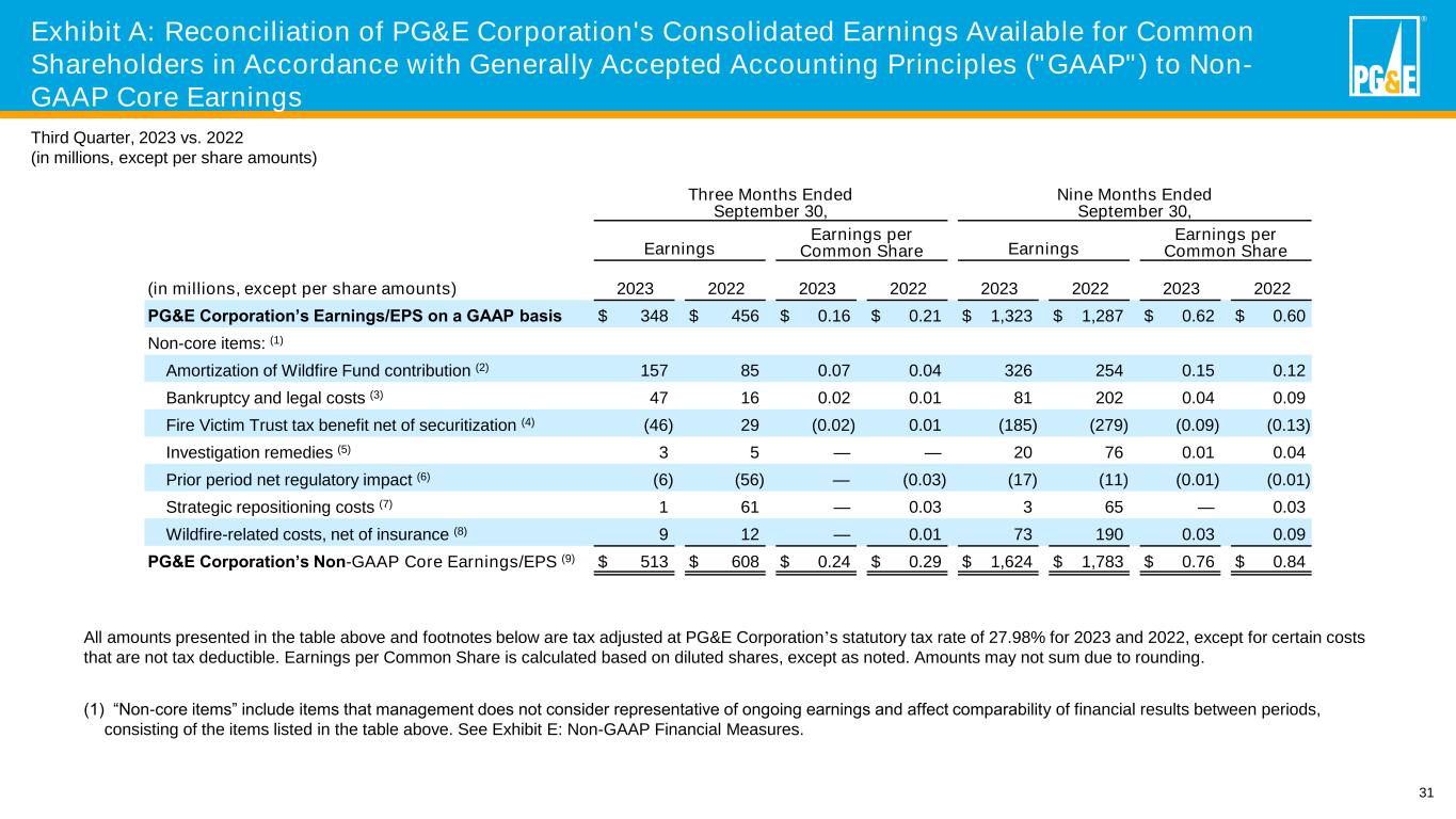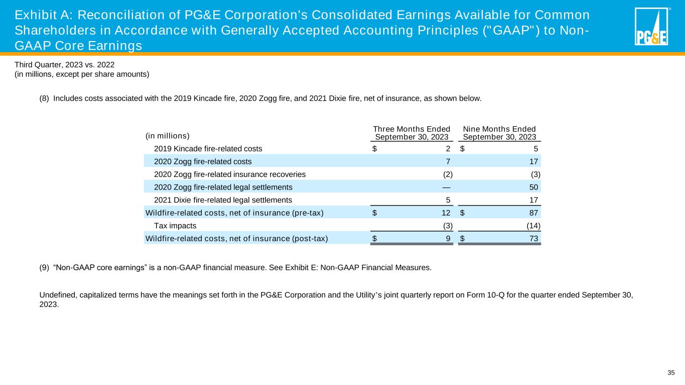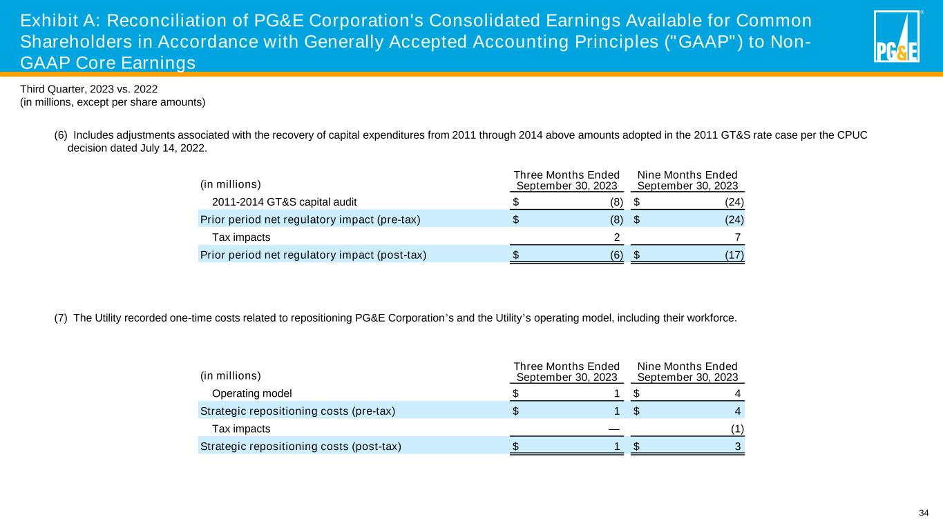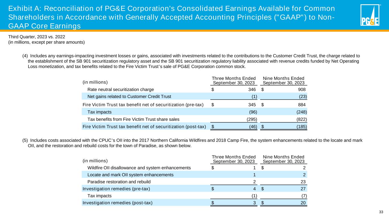 33 Third Quarter, 2023 vs. 2022 (in millions, except per share amounts) (4) Includes any earnings-impacting investment losses or gains, associated with investments related to the contributions to the Customer Credit Trust, the charge related to the establishment of the SB 901 securitization regulatory asset and the SB 901 securitization regulatory liability associated with revenue credits funded by Net Operating Loss monetization, and tax benefits related to the Fire Victim Trust’s sale of PG&E Corporation common stock. (in millions) Three Months Ended September 30, 2023 Nine Months Ended September 30, 2023 Wildfire OII disallowance and system enhancements $ 1 $ 2 Locate and mark OII system enhancements 1 2 Paradise restoration and rebuild 2 23 Investigation remedies (pre-tax) $ 4 $ 27 Tax impacts (1) (7) Investigation remedies (post-tax) $ 3 $ 20 (5) Includes costs associated with the CPUC’s OII into the 2017 Northern California Wildfires and 2018 Camp Fire, the system enhancements related to the locate and mark OII, and the restoration and rebuild costs for the town of Paradise, as shown below. (in millions) Three Months Ended September 30, 2023 Nine Months Ended September 30, 2023 Rate neutral securitization charge $ 346 $ 908 Net gains related to Customer Credit Trust (1) (23) Fire Victim Trust tax benefit net of securitization (pre-tax) $ 345 $ 884 Tax impacts (96) (248) Tax benefits from Fire Victim Trust share sales (295) (822) Fire Victim Trust tax benefit net of securitization (post-tax) $ (46) $ (185) Exhibit A: Reconciliation of PG&E Corporation's Consolidated Earnings Available for Common Shareholders in Accordance with Generally Accepted Accounting Principles ("GAAP") to Non- GAAP Core Earnings