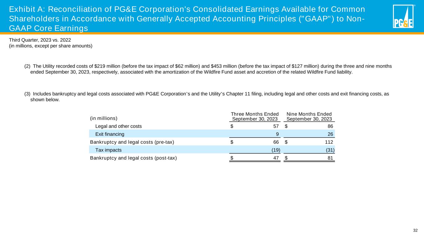 31 Exhibit A: Reconciliation of PG&E Corporation's Consolidated Earnings Available for Common Shareholders in Accordance with Generally Accepted Accounting Principles ("GAAP") to Non- GAAP Core Earnings Three Months Ended September 30, Nine Months Ended September 30, Earnings Earnings per Common Share Earnings Earnings per Common Share (in millions, except per share amounts) 2023 2022 2023 2022 2023 2022 2023 2022 PG&E Corporation’s Earnings/EPS on a GAAP basis $ 348 $ 456 $ 0.16 $ 0.21 $ 1,323 $ 1,287 $ 0.62 $ 0.60 Non-core items: (1) Amortization of Wildfire Fund contribution (2) 157 85 0.07 0.04 326 254 0.15 0.12 Bankruptcy and legal costs (3) 47 16 0.02 0.01 81 202 0.04 0.09 Fire Victim Trust tax benefit net of securitization (4) (46) 29 (0.02) 0.01 (185) (279) (0.09) (0.13) Investigation remedies (5) 3 5 — — 20 76 0.01 0.04 Prior period net regulatory impact (6) (6) (56) — (0.03) (17) (11) (0.01) (0.01) Strategic repositioning costs (7) 1 61 — 0.03 3 65 — 0.03 Wildfire-related costs, net of insurance (8) 9 12 — 0.01 73 190 0.03 0.09 PG&E Corporation’s Non-GAAP Core Earnings/EPS (9) $ 513 $ 608 $ 0.24 $ 0.29 $ 1,624 $ 1,783 $ 0.76 $ 0.84 All amounts presented in the table above and footnotes below are tax adjusted at PG&E Corporation’s statutory tax rate of 27.98% for 2023 and 2022, except for certain costs that are not tax deductible. Earnings per Common Share is calculated based on diluted shares, except as noted. Amounts may not sum due to rounding. Third Quarter, 2023 vs. 2022 (in millions, except per share amounts) (1) “Non-core items” include items that management does not consider representative of ongoing earnings and affect comparability of financial results between periods, consisting of the items listed in the table above. See Exhibit E: Non-GAAP Financial Measures.
