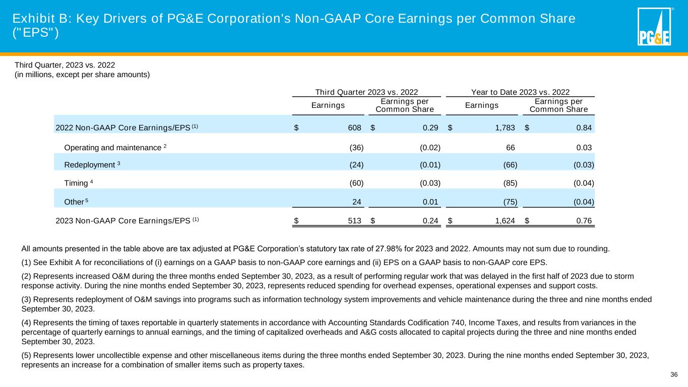 35 Third Quarter, 2023 vs. 2022 (in millions, except per share amounts) (9) “Non-GAAP core earnings” is a non-GAAP financial measure. See Exhibit E: Non-GAAP Financial Measures. Undefined, capitalized terms have the meanings set forth in the PG&E Corporation and the Utility’s joint quarterly report on Form 10-Q for the quarter ended September 30, 2023. (8) Includes costs associated with the 2019 Kincade fire, 2020 Zogg fire, and 2021 Dixie fire, net of insurance, as shown below. (in millions) Three Months Ended September 30, 2023 Nine Months Ended September 30, 2023 2019 Kincade fire-related costs $ 2 $ 5 2020 Zogg fire-related costs 7 17 2020 Zogg fire-related insurance recoveries (2) (3) 2020 Zogg fire-related legal settlements — 50 2021 Dixie fire-related legal settlements 5 17 Wildfire-related costs, net of insurance (pre-tax) $ 12 $ 87 Tax impacts (3) (14) Wildfire-related costs, net of insurance (post-tax) $ 9 $ 73 Exhibit A: Reconciliation of PG&E Corporation's Consolidated Earnings Available for Common Shareholders in Accordance with Generally Accepted Accounting Principles ("GAAP") to Non- GAAP Core Earnings