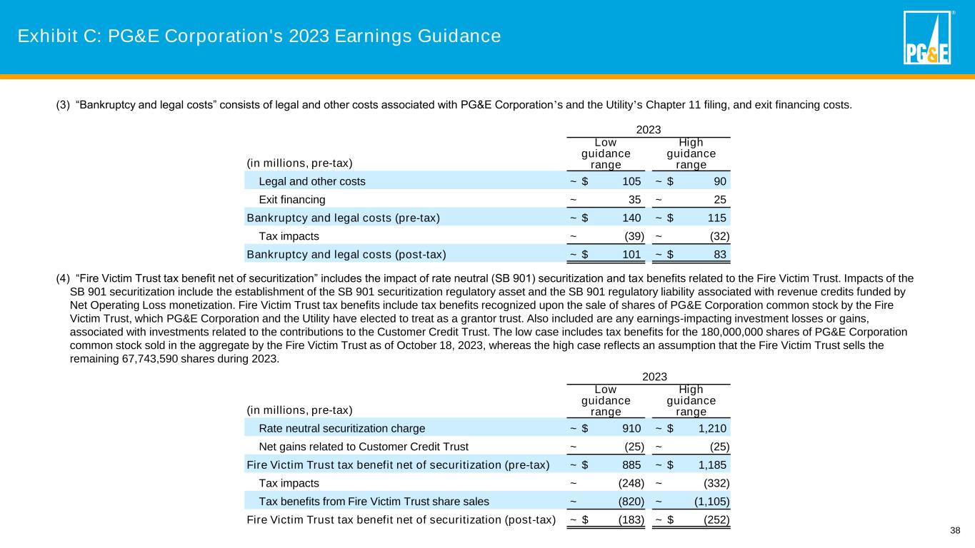 37 2023 EPS Guidance Low High Estimated EPS on a GAAP basis ~ $ 0.99 ~ $ 1.08 Estimated Non-Core Items: (1) Amortization of Wildfire Fund contribution (2) ~ 0.19 ~ 0.19 Bankruptcy and legal costs (3) ~ 0.05 ~ 0.04 Fire Victim Trust tax benefit net of securitization (4) ~ (0.09) ~ (0.12) Investigation remedies (5) ~ 0.02 ~ 0.02 Prior period net regulatory impact (6) ~ (0.01) ~ (0.01) Strategic repositioning costs (7) ~ — ~ — Wildfire-related costs, net of insurance (8) ~ 0.03 ~ 0.03 Estimated EPS on a non-GAAP Core Earnings basis ~ $ 1.19 ~ $ 1.23 All amounts presented in the table above and footnotes below are tax adjusted at PG&E Corporation’s statutory tax rate of 27.98% for 2023, except for certain costs that are not tax deductible. Amounts may not sum due to rounding. (1) “Non-core items” include items that management does not consider representative of ongoing earnings and affect comparability of financial results between periods. See Exhibit E: Non-GAAP Financial Measures. 2023 (in millions, pre-tax) Low guidance range High guidance range Amortization of Wildfire Fund contribution ~ $ 570 ~ $ 570 Amortization of Wildfire Fund contribution (pre-tax) ~ $ 570 ~ $ 570 Tax impacts ~ (159) ~ (159) Amortization of Wildfire Fund contribution (post-tax) ~ $ 411 ~ $ 411 (2) “Amortization of Wildfire Fund contribution” represents the amortization of the Wildfire Fund asset and accretion of the related Wildfire Fund liability. Exhibit C: PG&E Corporation's 2023 Earnings Guidance