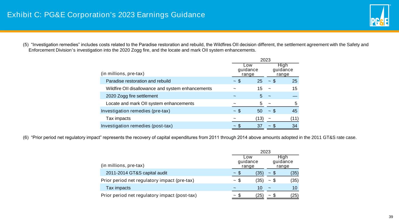 39 (6) “Prior period net regulatory impact” represents the recovery of capital expenditures from 2011 through 2014 above amounts adopted in the 2011 GT&S rate case. (5) “Investigation remedies” includes costs related to the Paradise restoration and rebuild, the Wildfires OII decision different, the settlement agreement with the Safety and Enforcement Division’s investigation into the 2020 Zogg fire, and the locate and mark OII system enhancements. 2023 (in millions, pre-tax) Low guidance range High guidance range Paradise restoration and rebuild ~ $ 25 ~ $ 25 Wildfire OII disallowance and system enhancements ~ 15 ~ 15 2020 Zogg fire settlement ~ 5 ~ — Locate and mark OII system enhancements ~ 5 ~ 5 Investigation remedies (pre-tax) ~ $ 50 ~ $ 45 Tax impacts ~ (13) ~ (11) Investigation remedies (post-tax) ~ $ 37 ~ $ 34 2023 (in millions, pre-tax) Low guidance range High guidance range 2011-2014 GT&S capital audit ~ $ (35) ~ $ (35) Prior period net regulatory impact (pre-tax) ~ $ (35) ~ $ (35) Tax impacts ~ 10 ~ 10 Prior period net regulatory impact (post-tax) ~ $ (25) ~ $ (25) Exhibit C: PG&E Corporation's 2023 Earnings Guidance
