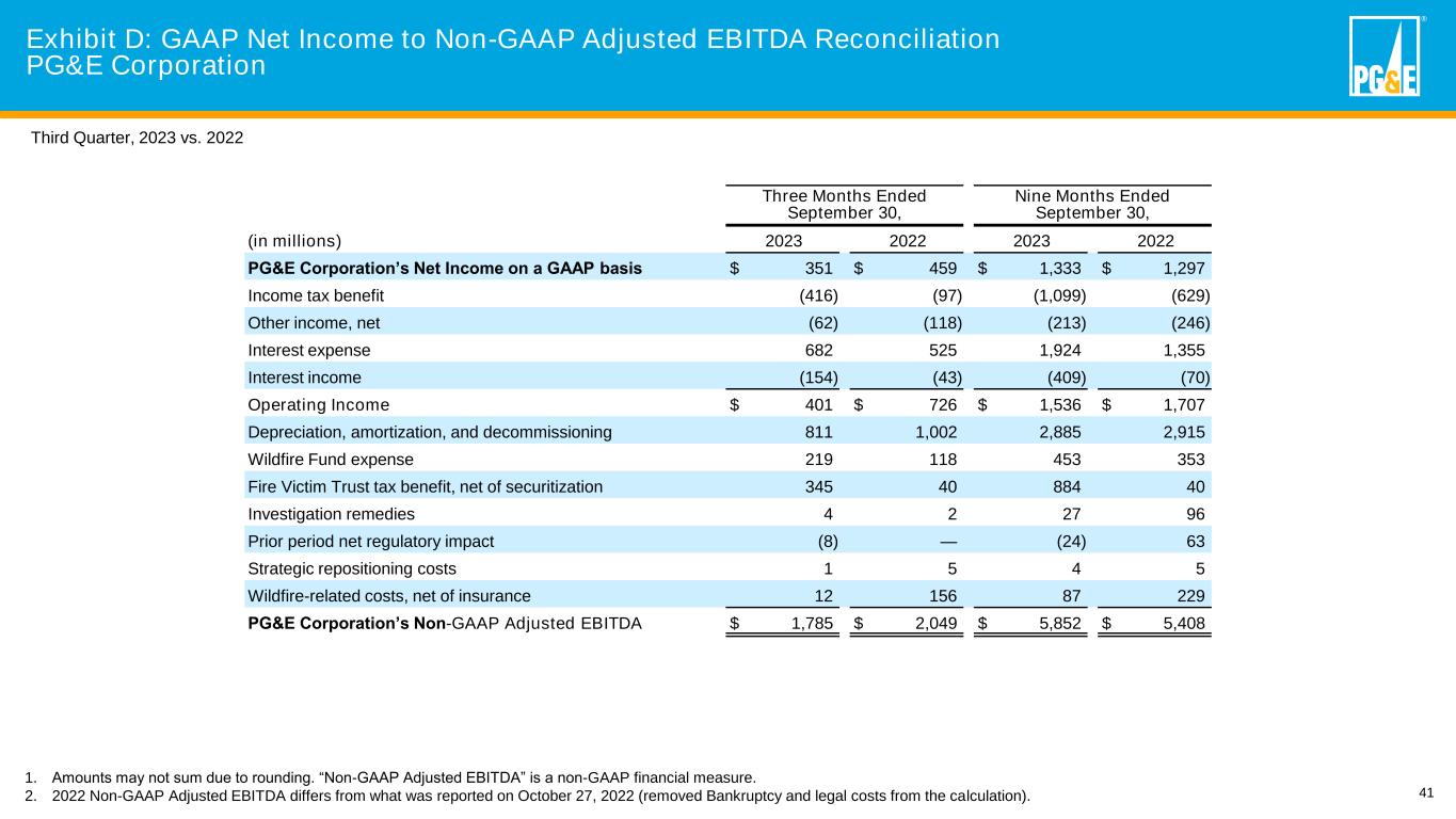 41 Three Months Ended September 30, Nine Months Ended September 30, (in millions) 2023 2022 2023 2022 PG&E Corporation’s Net Income on a GAAP basis $ 351 $ 459 $ 1,333 $ 1,297 Income tax benefit (416) (97) (1,099) (629) Other income, net (62) (118) (213) (246) Interest expense 682 525 1,924 1,355 Interest income (154) (43) (409) (70) Operating Income $ 401 $ 726 $ 1,536 $ 1,707 Depreciation, amortization, and decommissioning 811 1,002 2,885 2,915 Wildfire Fund expense 219 118 453 353 Fire Victim Trust tax benefit, net of securitization 345 40 884 40 Investigation remedies 4 2 27 96 Prior period net regulatory impact (8) — (24) 63 Strategic repositioning costs 1 5 4 5 Wildfire-related costs, net of insurance 12 156 87 229 PG&E Corporation’s Non-GAAP Adjusted EBITDA $ 1,785 $ 2,049 $ 5,852 $ 5,408 Third Quarter, 2023 vs. 2022 1. Amounts may not sum due to rounding. “Non-GAAP Adjusted EBITDA” is a non-GAAP financial measure. 2. 2022 Non-GAAP Adjusted EBITDA differs from what was reported on October 27, 2022 (removed Bankruptcy and legal costs from the calculation). Exhibit D: GAAP Net Income to Non-GAAP Adjusted EBITDA Reconciliation PG&E Corporation