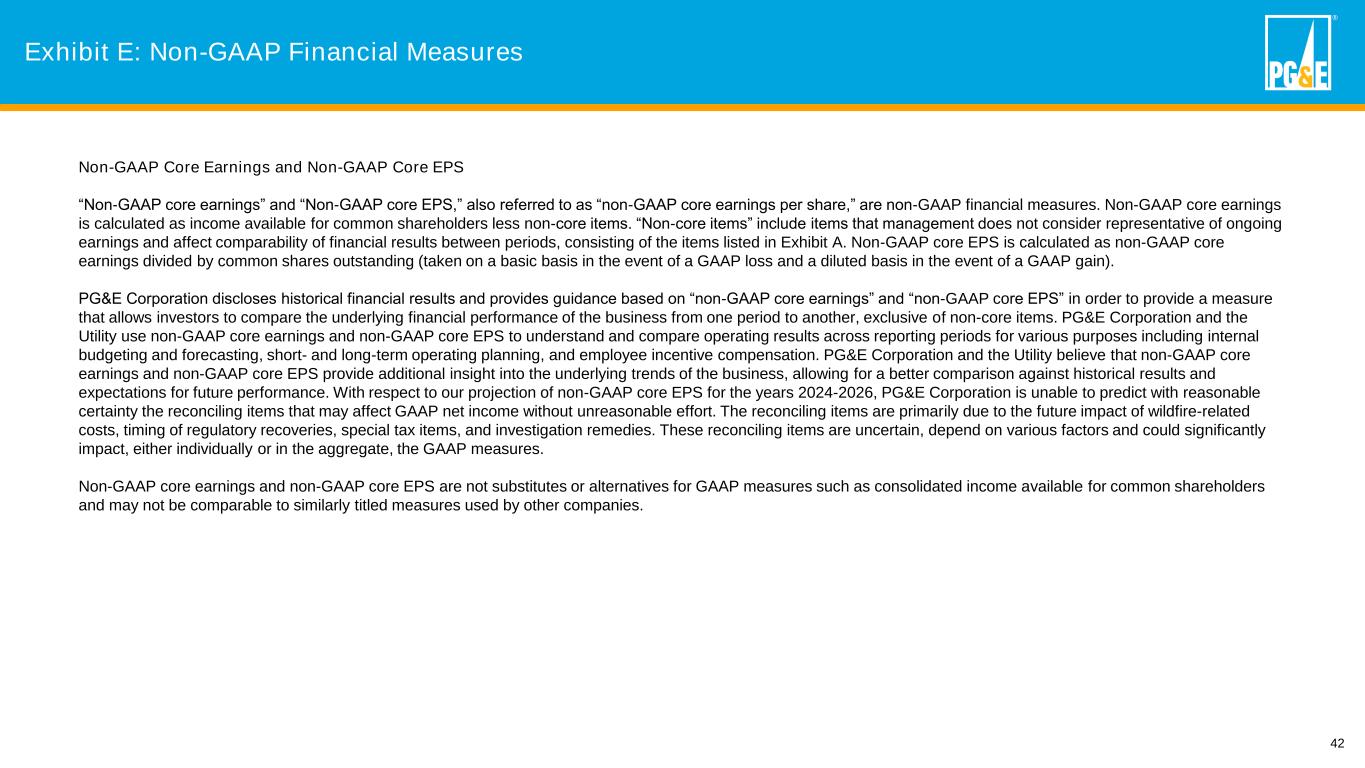 42 Non-GAAP Core Earnings and Non-GAAP Core EPS “Non-GAAP core earnings” and “Non-GAAP core EPS,” also referred to as “non-GAAP core earnings per share,” are non-GAAP financial measures. Non-GAAP core earnings is calculated as income available for common shareholders less non-core items. “Non-core items” include items that management does not consider representative of ongoing earnings and affect comparability of financial results between periods, consisting of the items listed in Exhibit A. Non-GAAP core EPS is calculated as non-GAAP core earnings divided by common shares outstanding (taken on a basic basis in the event of a GAAP loss and a diluted basis in the event of a GAAP gain). PG&E Corporation discloses historical financial results and provides guidance based on “non-GAAP core earnings” and “non-GAAP core EPS” in order to provide a measure that allows investors to compare the underlying financial performance of the business from one period to another, exclusive of non-core items. PG&E Corporation and the Utility use non-GAAP core earnings and non-GAAP core EPS to understand and compare operating results across reporting periods for various purposes including internal budgeting and forecasting, short- and long-term operating planning, and employee incentive compensation. PG&E Corporation and the Utility believe that non-GAAP core earnings and non-GAAP core EPS provide additional insight into the underlying trends of the business, allowing for a better comparison against historical results and expectations for future performance. With respect to our projection of non-GAAP core EPS for the years 2024-2026, PG&E Corporation is unable to predict with reasonable certainty the reconciling items that may affect GAAP net income without unreasonable effort. The reconciling items are primarily due to the future impact of wildfire-related costs, timing of regulatory recoveries, special tax items, and investigation remedies. These reconciling items are uncertain, depend on various factors and could significantly impact, either individually or in the aggregate, the GAAP measures. Non-GAAP core earnings and non-GAAP core EPS are not substitutes or alternatives for GAAP measures such as consolidated income available for common shareholders and may not be comparable to similarly titled measures used by other companies. Exhibit E: Non-GAAP Financial Measures