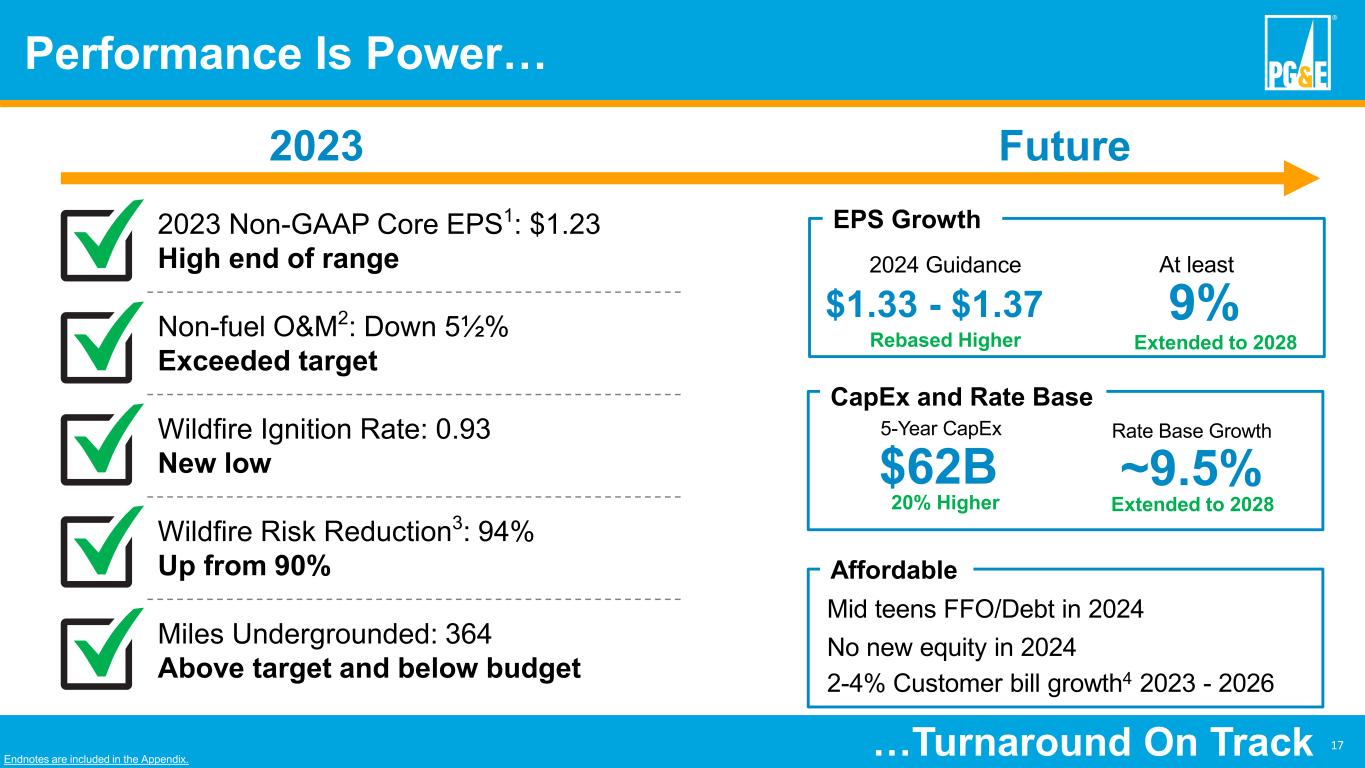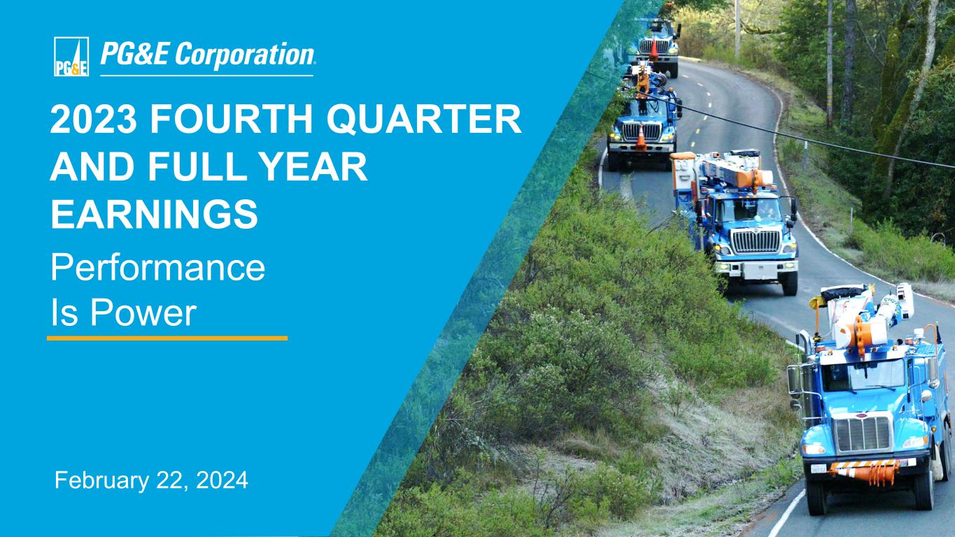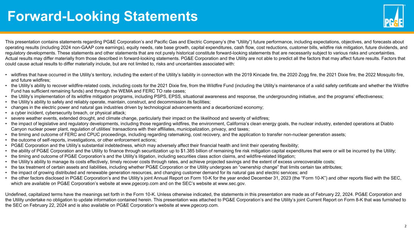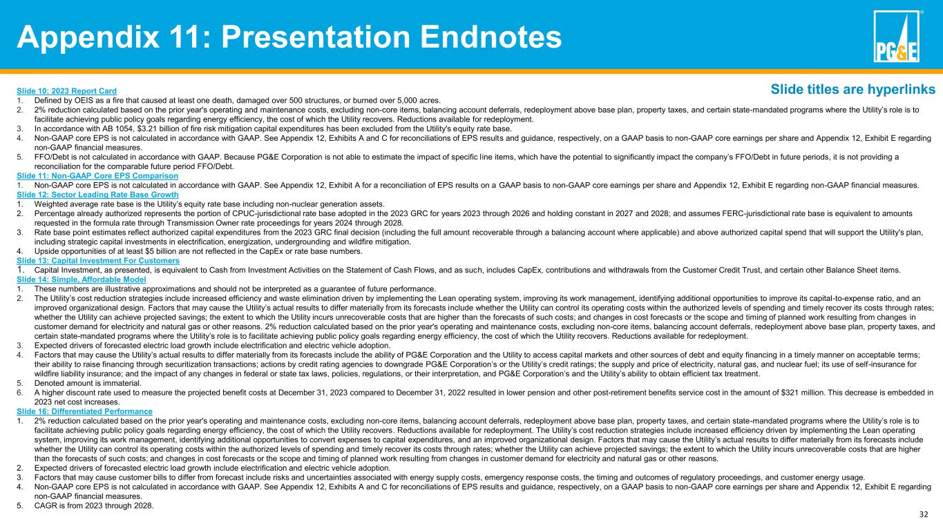 32 Slide titles are hyperlinksSlide 10: 2023 Report Card 1. Defined by OEIS as a fire that caused at least one death, damaged over 500 structures, or burned over 5,000 acres. 2. 2% reduction calculated based on the prior year's operating and maintenance costs, excluding non-core items, balancing account deferrals, redeployment above base plan, property taxes, and certain state-mandated programs where the Utility’s role is to facilitate achieving public policy goals regarding energy efficiency, the cost of which the Utility recovers. Reductions available for redeployment. 3. In accordance with AB 1054, $3.21 billion of fire risk mitigation capital expenditures has been excluded from the Utility's equity rate base. 4. Non-GAAP core EPS is not calculated in accordance with GAAP. See Appendix 12, Exhibits A and C for reconciliations of EPS results and guidance, respectively, on a GAAP basis to non-GAAP core earnings per share and Appendix 12, Exhibit E regarding non-GAAP financial measures. 5. FFO/Debt is not calculated in accordance with GAAP. Because PG&E Corporation is not able to estimate the impact of specific line items, which have the potential to significantly impact the company’s FFO/Debt in future periods, it is not providing a reconciliation for the comparable future period FFO/Debt. Slide 11: Non-GAAP Core EPS Comparison 1. Non-GAAP core EPS is not calculated in accordance with GAAP. See Appendix 12, Exhibit A for a reconciliation of EPS results on a GAAP basis to non-GAAP core earnings per share and Appendix 12, Exhibit E regarding non-GAAP financial measures. Slide 12: Sector Leading Rate Base Growth 1. Weighted average rate base is the Utility’s equity rate base including non-nuclear generation assets. 2. Percentage already authorized represents the portion of CPUC-jurisdictional rate base adopted in the 2023 GRC for years 2023 through 2026 and holding constant in 2027 and 2028; and assumes FERC-jurisdictional rate base is equivalent to amounts requested in the formula rate through Transmission Owner rate proceedings for years 2024 through 2028. 3. Rate base point estimates reflect authorized capital expenditures from the 2023 GRC final decision (including the full amount recoverable through a balancing account where applicable) and above authorized capital spend that will support the Utility's plan, including strategic capital investments in electrification, energization, undergrounding and wildfire mitigation. 4. Upside opportunities of at least $5 billion are not reflected in the CapEx or rate base numbers. Slide 13: Capital Investment For Customers 1. Capital Investment, as presented, is equivalent to Cash from Investment Activities on the Statement of Cash Flows, and as such, includes CapEx, contributions and withdrawals from the Customer Credit Trust, and certain other Balance Sheet items. Slide 14: Simple, Affordable Model 1. These numbers are illustrative approximations and should not be interpreted as a guarantee of future performance. 2. The Utility’s cost reduction strategies include increased efficiency and waste elimination driven by implementing the Lean operating system, improving its work management, identifying additional opportunities to improve its capital-to-expense ratio, and an improved organizational design. Factors that may cause the Utility’s actual results to differ materially from its forecasts include whether the Utility can control its operating costs within the authorized levels of spending and timely recover its costs through rates; whether the Utility can achieve projected savings; the extent to which the Utility incurs unrecoverable costs that are higher than the forecasts of such costs; and changes in cost forecasts or the scope and timing of planned work resulting from changes in customer demand for electricity and natural gas or other reasons. 2% reduction calculated based on the prior year's operating and maintenance costs, excluding non-core items, balancing account deferrals, redeployment above base plan, property taxes, and certain state-mandated programs where the Utility’s role is to facilitate achieving public policy goals regarding energy efficiency, the cost of which the Utility recovers. Reductions available for redeployment. 3. Expected drivers of forecasted electric load growth include electrification and electric vehicle adoption. 4. Factors that may cause the Utility’s actual results to differ materially from its forecasts include the ability of PG&E Corporation and the Utility to access capital markets and other sources of debt and equity financing in a timely manner on acceptable terms; their ability to raise financing through securitization transactions; actions by credit rating agencies to downgrade PG&E Corporation’s or the Utility’s credit ratings; the supply and price of electricity, natural gas, and nuclear fuel; its use of self-insurance for wildfire liability insurance; and the impact of any changes in federal or state tax laws, policies, regulations, or their interpretation, and PG&E Corporation’s and the Utility’s ability to obtain efficient tax treatment. 5. Denoted amount is immaterial. 6. A higher discount rate used to measure the projected benefit costs at December 31, 2023 compared to December 31, 2022 resulted in lower pension and other post-retirement benefits service cost in the amount of $321 million. This decrease is embedded in 2023 net cost increases. Slide 16: Differentiated Performance 1. 2% reduction calculated based on the prior year's operating and maintenance costs, excluding non-core items, balancing account deferrals, redeployment above base plan, property taxes, and certain state-mandated programs where the Utility’s role is to facilitate achieving public policy goals regarding energy efficiency, the cost of which the Utility recovers. Reductions available for redeployment. The Utility’s cost reduction strategies include increased efficiency driven by implementing the L