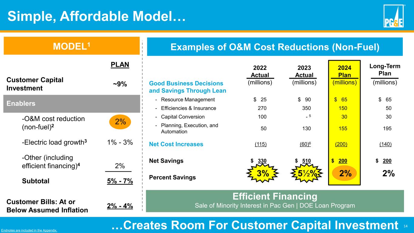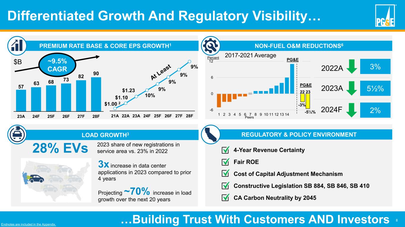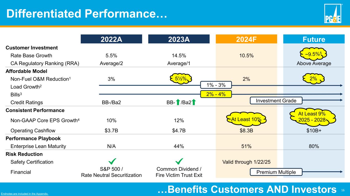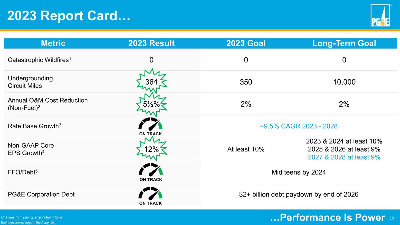 32 Slide titles are hyperlinksSlide 10: 2023 Report Card 1. Defined by OEIS as a fire that caused at least one death, damaged over 500 structures, or burned over 5,000 acres. 2. 2% reduction calculated based on the prior year's operating and maintenance costs, excluding non-core items, balancing account deferrals, redeployment above base plan, property taxes, and certain state-mandated programs where the Utility’s role is to facilitate achieving public policy goals regarding energy efficiency, the cost of which the Utility recovers. Reductions available for redeployment. 3. In accordance with AB 1054, $3.21 billion of fire risk mitigation capital expenditures has been excluded from the Utility's equity rate base. 4. Non-GAAP core EPS is not calculated in accordance with GAAP. See Appendix 12, Exhibits A and C for reconciliations of EPS results and guidance, respectively, on a GAAP basis to non-GAAP core earnings per share and Appendix 12, Exhibit E regarding non-GAAP financial measures. 5. FFO/Debt is not calculated in accordance with GAAP. Because PG&E Corporation is not able to estimate the impact of specific line items, which have the potential to significantly impact the company’s FFO/Debt in future periods, it is not providing a reconciliation for the comparable future period FFO/Debt. Slide 11: Non-GAAP Core EPS Comparison 1. Non-GAAP core EPS is not calculated in accordance with GAAP. See Appendix 12, Exhibit A for a reconciliation of EPS results on a GAAP basis to non-GAAP core earnings per share and Appendix 12, Exhibit E regarding non-GAAP financial measures. Slide 12: Sector Leading Rate Base Growth 1. Weighted average rate base is the Utility’s equity rate base including non-nuclear generation assets. 2. Percentage already authorized represents the portion of CPUC-jurisdictional rate base adopted in the 2023 GRC for years 2023 through 2026 and holding constant in 2027 and 2028; and assumes FERC-jurisdictional rate base is equivalent to amounts requested in the formula rate through Transmission Owner rate proceedings for years 2024 through 2028. 3. Rate base point estimates reflect authorized capital expenditures from the 2023 GRC final decision (including the full amount recoverable through a balancing account where applicable) and above authorized capital spend that will support the Utility's plan, including strategic capital investments in electrification, energization, undergrounding and wildfire mitigation. 4. Upside opportunities of at least $5 billion are not reflected in the CapEx or rate base numbers. Slide 13: Capital Investment For Customers 1. Capital Investment, as presented, is equivalent to Cash from Investment Activities on the Statement of Cash Flows, and as such, includes CapEx, contributions and withdrawals from the Customer Credit Trust, and certain other Balance Sheet items. Slide 14: Simple, Affordable Model 1. These numbers are illustrative approximations and should not be interpreted as a guarantee of future performance. 2. The Utility’s cost reduction strategies include increased efficiency and waste elimination driven by implementing the Lean operating system, improving its work management, identifying additional opportunities to improve its capital-to-expense ratio, and an improved organizational design. Factors that may cause the Utility’s actual results to differ materially from its forecasts include whether the Utility can control its operating costs within the authorized levels of spending and timely recover its costs through rates; whether the Utility can achieve projected savings; the extent to which the Utility incurs unrecoverable costs that are higher than the forecasts of such costs; and changes in cost forecasts or the scope and timing of planned work resulting from changes in customer demand for electricity and natural gas or other reasons. 2% reduction calculated based on the prior year's operating and maintenance costs, excluding non-core items, balancing account deferrals, redeployment above base plan, property taxes, and certain state-mandated programs where the Utility’s role is to facilitate achieving public policy goals regarding energy efficiency, the cost of which the Utility recovers. Reductions available for redeployment. 3. Expected drivers of forecasted electric load growth include electrification and electric vehicle adoption. 4. Factors that may cause the Utility’s actual results to differ materially from its forecasts include the ability of PG&E Corporation and the Utility to access capital markets and other sources of debt and equity financing in a timely manner on acceptable terms; their ability to raise financing through securitization transactions; actions by credit rating agencies to downgrade PG&E Corporation’s or the Utility’s credit ratings; the supply and price of electricity, natural gas, and nuclear fuel; its use of self-insurance for wildfire liability insurance; and the impact of any changes in federal or state tax laws, policies, regulations, or their interpretation, and PG&E Corporation’s and the Utility’s ability to obtain efficient tax treatment. 5. Denoted amount is immaterial. 6. A higher discount rate used to measure the projected benefit costs at December 31, 2023 compared to December 31, 2022 resulted in lower pension and other post-retirement benefits service cost in the amount of $321 million. This decrease is embedded in 2023 net cost increases. Slide 16: Differentiated Performance 1. 2% reduction calculated based on the prior year's operating and maintenance costs, excluding non-core items, balancing account deferrals, redeployment above base plan, property taxes, and certain state-mandated programs where the Utility’s role is to facilitate achieving public policy goals regarding energy efficiency, the cost of which the Utility recovers. Reductions available for redeployment. The Utility’s cost reduction strategies include increased efficiency driven by implementing the L
