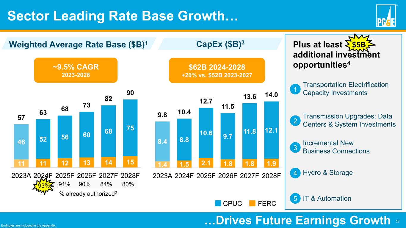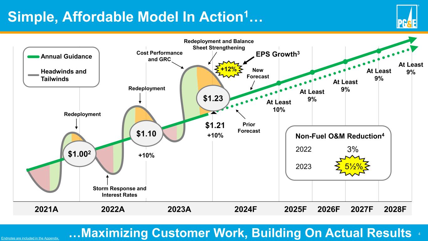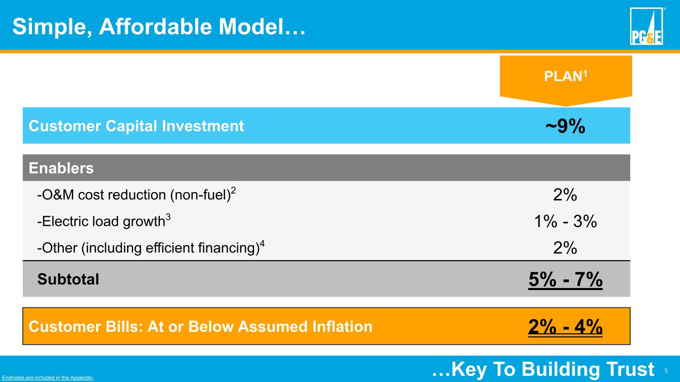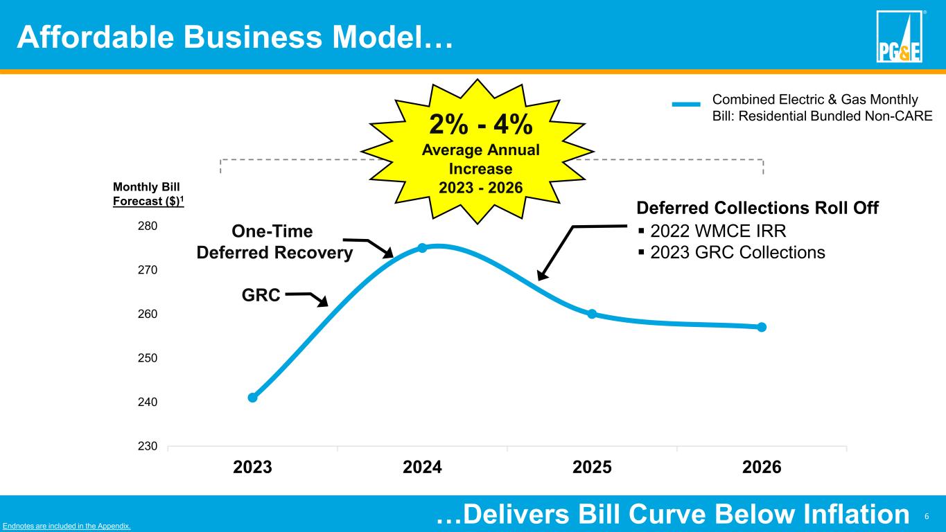 32 Slide titles are hyperlinksSlide 10: 2023 Report Card 1. Defined by OEIS as a fire that caused at least one death, damaged over 500 structures, or burned over 5,000 acres. 2. 2% reduction calculated based on the prior year's operating and maintenance costs, excluding non-core items, balancing account deferrals, redeployment above base plan, property taxes, and certain state-mandated programs where the Utility’s role is to facilitate achieving public policy goals regarding energy efficiency, the cost of which the Utility recovers. Reductions available for redeployment. 3. In accordance with AB 1054, $3.21 billion of fire risk mitigation capital expenditures has been excluded from the Utility's equity rate base. 4. Non-GAAP core EPS is not calculated in accordance with GAAP. See Appendix 12, Exhibits A and C for reconciliations of EPS results and guidance, respectively, on a GAAP basis to non-GAAP core earnings per share and Appendix 12, Exhibit E regarding non-GAAP financial measures. 5. FFO/Debt is not calculated in accordance with GAAP. Because PG&E Corporation is not able to estimate the impact of specific line items, which have the potential to significantly impact the company’s FFO/Debt in future periods, it is not providing a reconciliation for the comparable future period FFO/Debt. Slide 11: Non-GAAP Core EPS Comparison 1. Non-GAAP core EPS is not calculated in accordance with GAAP. See Appendix 12, Exhibit A for a reconciliation of EPS results on a GAAP basis to non-GAAP core earnings per share and Appendix 12, Exhibit E regarding non-GAAP financial measures. Slide 12: Sector Leading Rate Base Growth 1. Weighted average rate base is the Utility’s equity rate base including non-nuclear generation assets. 2. Percentage already authorized represents the portion of CPUC-jurisdictional rate base adopted in the 2023 GRC for years 2023 through 2026 and holding constant in 2027 and 2028; and assumes FERC-jurisdictional rate base is equivalent to amounts requested in the formula rate through Transmission Owner rate proceedings for years 2024 through 2028. 3. Rate base point estimates reflect authorized capital expenditures from the 2023 GRC final decision (including the full amount recoverable through a balancing account where applicable) and above authorized capital spend that will support the Utility's plan, including strategic capital investments in electrification, energization, undergrounding and wildfire mitigation. 4. Upside opportunities of at least $5 billion are not reflected in the CapEx or rate base numbers. Slide 13: Capital Investment For Customers 1. Capital Investment, as presented, is equivalent to Cash from Investment Activities on the Statement of Cash Flows, and as such, includes CapEx, contributions and withdrawals from the Customer Credit Trust, and certain other Balance Sheet items. Slide 14: Simple, Affordable Model 1. These numbers are illustrative approximations and should not be interpreted as a guarantee of future performance. 2. The Utility’s cost reduction strategies include increased efficiency and waste elimination driven by implementing the Lean operating system, improving its work management, identifying additional opportunities to improve its capital-to-expense ratio, and an improved organizational design. Factors that may cause the Utility’s actual results to differ materially from its forecasts include whether the Utility can control its operating costs within the authorized levels of spending and timely recover its costs through rates; whether the Utility can achieve projected savings; the extent to which the Utility incurs unrecoverable costs that are higher than the forecasts of such costs; and changes in cost forecasts or the scope and timing of planned work resulting from changes in customer demand for electricity and natural gas or other reasons. 2% reduction calculated based on the prior year's operating and maintenance costs, excluding non-core items, balancing account deferrals, redeployment above base plan, property taxes, and certain state-mandated programs where the Utility’s role is to facilitate achieving public policy goals regarding energy efficiency, the cost of which the Utility recovers. Reductions available for redeployment. 3. Expected drivers of forecasted electric load growth include electrification and electric vehicle adoption. 4. Factors that may cause the Utility’s actual results to differ materially from its forecasts include the ability of PG&E Corporation and the Utility to access capital markets and other sources of debt and equity financing in a timely manner on acceptable terms; their ability to raise financing through securitization transactions; actions by credit rating agencies to downgrade PG&E Corporation’s or the Utility’s credit ratings; the supply and price of electricity, natural gas, and nuclear fuel; its use of self-insurance for wildfire liability insurance; and the impact of any changes in federal or state tax laws, policies, regulations, or their interpretation, and PG&E Corporation’s and the Utility’s ability to obtain efficient tax treatment. 5. Denoted amount is immaterial. 6. A higher discount rate used to measure the projected benefit costs at December 31, 2023 compared to December 31, 2022 resulted in lower pension and other post-retirement benefits service cost in the amount of $321 million. This decrease is embedded in 2023 net cost increases. Slide 16: Differentiated Performance 1. 2% reduction calculated based on the prior year's operating and maintenance costs, excluding non-core items, balancing account deferrals, redeployment above base plan, property taxes, and certain state-mandated programs where the Utility’s role is to facilitate achieving public policy goals regarding energy efficiency, the cost of which the Utility recovers. Reductions available for redeployment. The Utility’s cost reduction strategies include increased efficiency driven by implementing the L