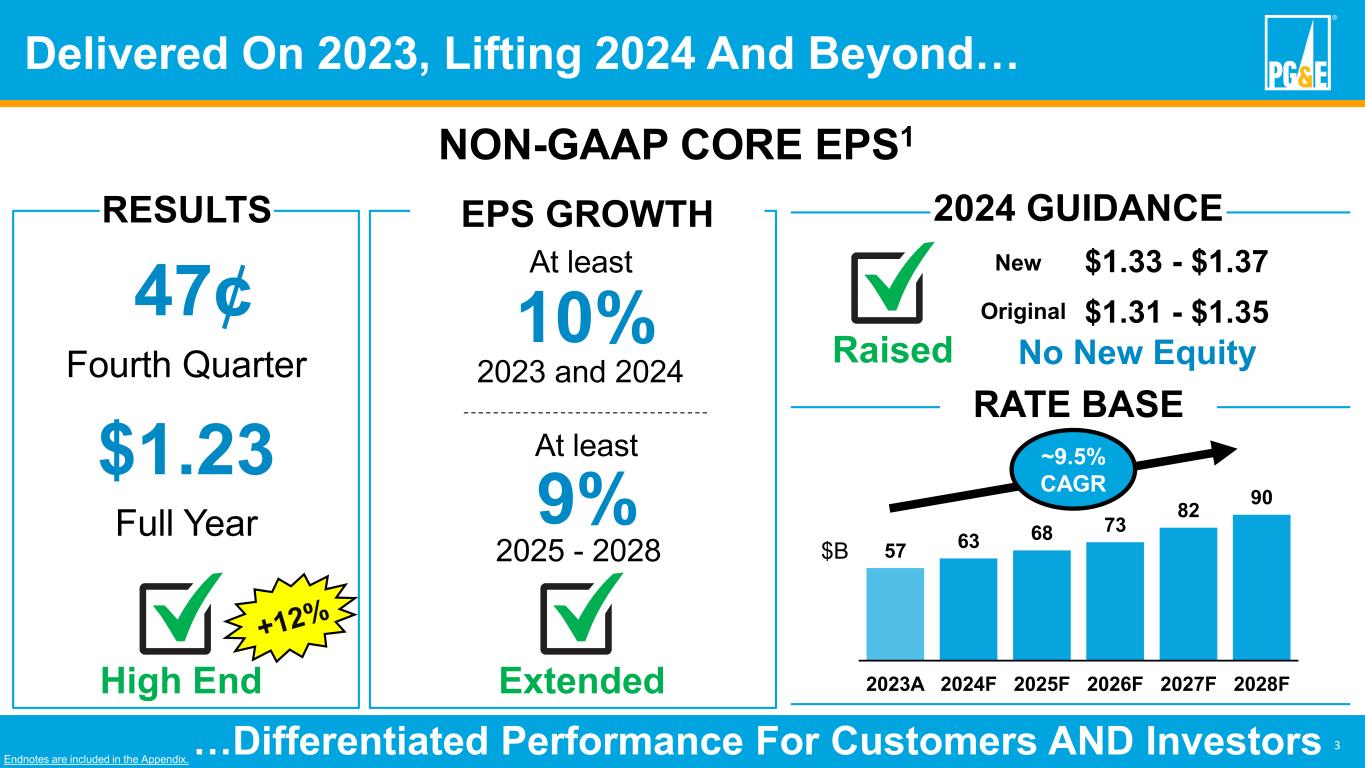 2 Forward-Looking Statements This presentation contains statements regarding PG&E Corporation’s and Pacific Gas and Electric Company’s (the “Utility”) future performance, including expectations, objectives, and forecasts about operating results (including 2024 non-GAAP core earnings), equity needs, rate base growth, capital expenditures, cash flow, cost reductions, customer bills, wildfire risk mitigation, future dividends, and regulatory developments. These statements and other statements that are not purely historical constitute forward-looking statements that are necessarily subject to various risks and uncertainties. Actual results may differ materially from those described in forward-looking statements. PG&E Corporation and the Utility are not able to predict all the factors that may affect future results. Factors that could cause actual results to differ materially include, but are not limited to, risks and uncertainties associated with: • wildfires that have occurred in the Utility’s territory, including the extent of the Utility’s liability in connection with the 2019 Kincade fire, the 2020 Zogg fire, the 2021 Dixie fire, the 2022 Mosquito fire, and future wildfires; • the Utility’s ability to recover wildfire-related costs, including costs for the 2021 Dixie fire, from the Wildfire Fund (including the Utility’s maintenance of a valid safety certificate and whether the Wildfire Fund has sufficient remaining funds) and through the WEMA and FERC TO rate cases; • the Utility’s implementation of its wildfire mitigation programs, including PSPS, EPSS, situational awareness and response, the undergrounding initiative, and the programs’ effectiveness; • the Utility’s ability to safely and reliably operate, maintain, construct, and decommission its facilities; • changes in the electric power and natural gas industries driven by technological advancements and a decarbonized economy; • a cyber incident, cybersecurity breach, or physical attack; • severe weather events, extended drought, and climate change, particularly their impact on the likelihood and severity of wildfires; • the impact of legislative and regulatory developments, including those regarding wildfires, the environment, California’s clean energy goals, the nuclear industry, extended operations at Diablo Canyon nuclear power plant, regulation of utilities’ transactions with their affiliates, municipalization, privacy, and taxes; • the timing and outcome of FERC and CPUC proceedings, including regarding ratemaking, cost recovery, and the application to transfer non-nuclear generation assets; • the outcome of self-reports, investigations, or other enforcement actions; • PG&E Corporation and the Utility’s substantial indebtedness, which may adversely affect their financial health and limit their operating flexibility; • the ability of PG&E Corporation and the Utility to finance through securitization up to $1.385 billion of remaining fire risk mitigation capital expenditures that were or will be incurred by the Utility; • the timing and outcome of PG&E Corporation’s and the Utility’s litigation, including securities class action claims, and wildfire-related litigation; • the Utility’s ability to manage its costs effectively, timely recover costs through rates, and achieve projected savings and the extent of excess unrecoverable costs; • the tax treatment of certain assets and liabilities, including whether PG&E Corporation or the Utility undergoes an “ownership change” that limits certain tax attributes; • the impact of growing distributed and renewable generation resources, and changing customer demand for its natural gas and electric services; and • the other factors disclosed in PG&E Corporation’s and the Utility’s joint Annual Report on Form 10-K for the year ended December 31, 2023 (the “Form 10-K”) and other reports filed with the SEC, which are available on PG&E Corporation’s website at www.pgecorp.com and on the SEC’s website at www.sec.gov. Undefined, capitalized terms have the meanings set forth in the Form 10-K. Unless otherwise indicated, the statements in this presentation are made as of February 22, 2024. PG&E Corporation and the Utility undertake no obligation to update information contained herein. This presentation was attached to PG&E Corporation’s and the Utility’s joint Current Report on Form 8-K that was furnished to the SEC on February 22, 2024 and is also available on PG&E Corporation’s website at www.pgecorp.com.