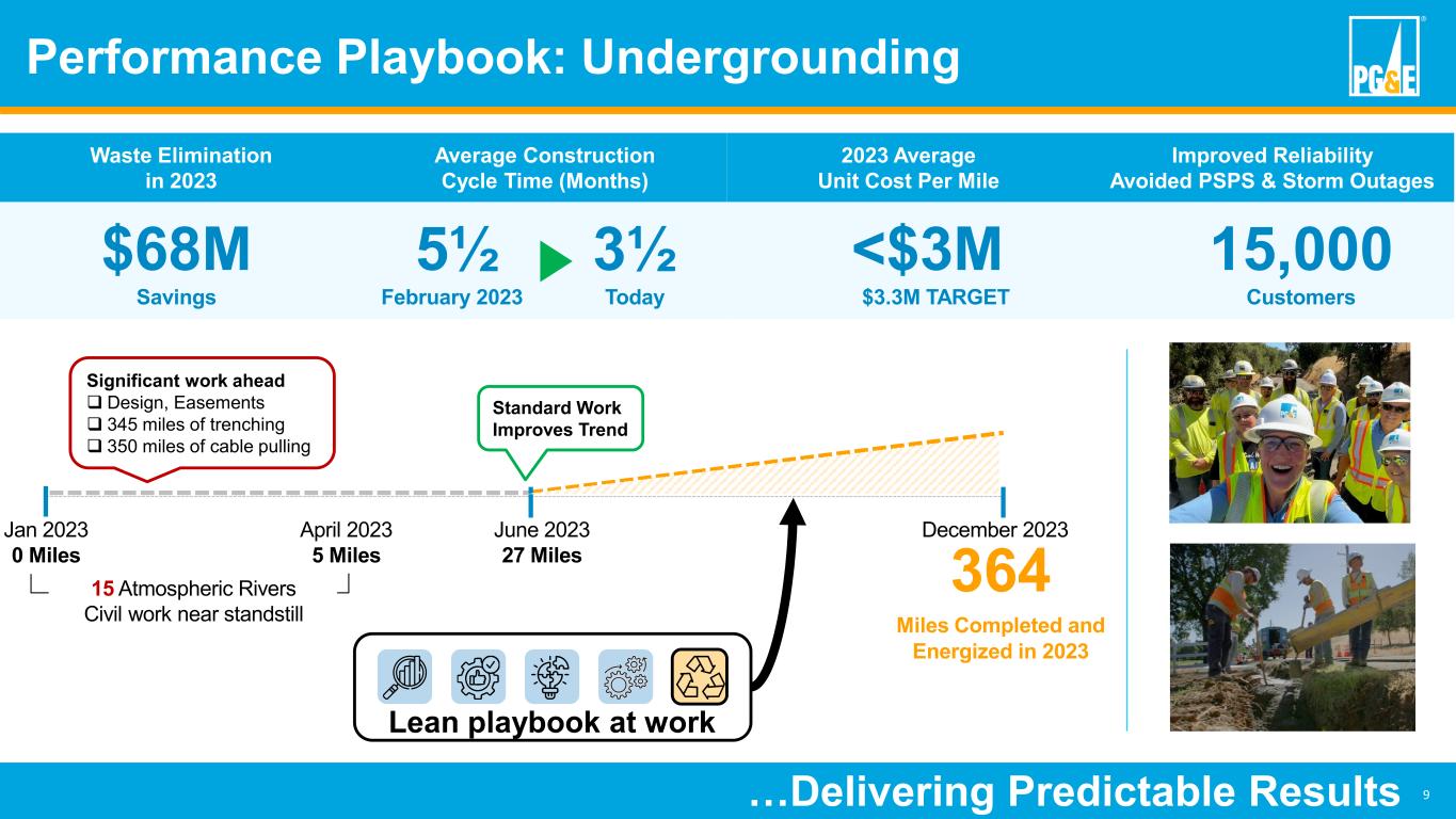 8 Endnotes are included in the Appendix. Differentiated Growth And Regulatory Visibility… …Building Trust With Customers AND Investors PREMIUM RATE BASE & CORE EPS GROWTH1 NON-FUEL O&M REDUCTIONS6 LOAD GROWTH3 2023 share of new registrations in service area vs. 23% in 2022 Projecting ~70% increase in load growth over the next 20 years 3x increase in data center applications in 2023 compared to prior 4 years 28% EVs REGULATORY & POLICY ENVIRONMENT 4-Year Revenue Certainty Fair ROE Cost of Capital Adjustment Mechanism Constructive Legislation SB 884, SB 846, SB 410 CA Carbon Neutrality by 2045 ~9.5% CAGR $1.00 2 $1.10 $1.23 10% 9% 9% 9% 9% 21A 22A 23A 24F 25F 26F 27F 28F 2022A 3% 2023A 5½% 2024F 2% 57 63 68 73 82 90 23A 24F 25F 26F 27F 28F -5½% -6 0 6 12 1 2 3 4 5 6 7 8 9 10 11 12 13 14 2017-2021 AveragePercent PG&E PG&E -3% 22 23 Peers $B
