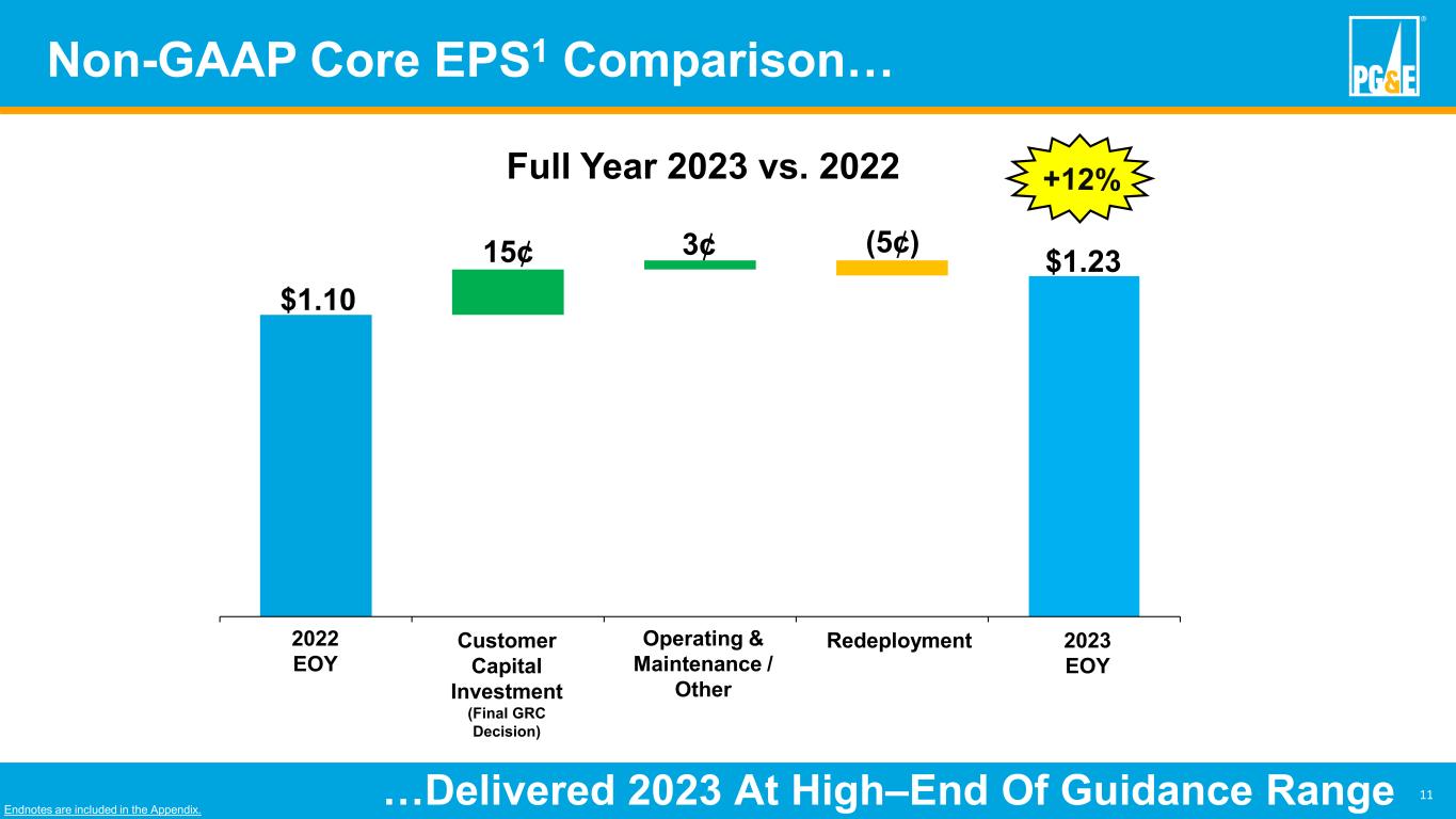 10 Endnotes are included in the Appendix. Changes from prior quarter noted in blue Metric 2023 Result 2023 Goal Long-Term Goal Catastrophic Wildfires1 0 0 0 Undergrounding Circuit Miles 364 350 10,000 Annual O&M Cost Reduction (Non-Fuel)2 5½% 2% 2% Rate Base Growth3 ~9.5% CAGR 2023 - 2028 Non-GAAP Core EPS Growth4 12% At least 10% 2023 & 2024 at least 10% 2025 & 2026 at least 9% 2027 & 2028 at least 9% FFO/Debt5 Mid teens by 2024 PG&E Corporation Debt $2+ billion debt paydown by end of 2026 2023 Report Card… …Performance Is Power ON TRACK ON TRACK ON TRACK