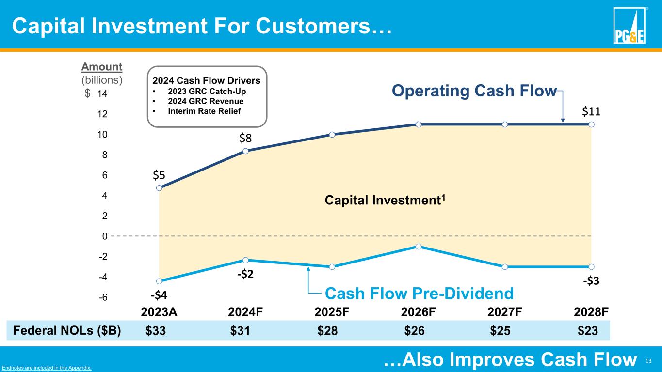12 Endnotes are included in the Appendix. Sector Leading Rate Base Growth… …Drives Future Earnings Growth Plus at least $5B additional investment opportunities4 1 Transportation Electrification Capacity Investments 3 Incremental New Business Connections 4 Hydro & Storage 5 IT & Automation 2 Transmission Upgrades: Data Centers & System Investments ~9.5% CAGR 2023-2028 CPUC FERC % already authorized2 93% 91% 90% 84% 80% $62B 2024-2028 +20% vs. $52B 2023-2027 Weighted Average Rate Base ($B)1 CapEx ($B)3 11 11 12 13 14 15 46 52 56 60 68 75 57 63 68 73 82 90 2023A 2024F 2025F 2026F 2027F 2028F 1.4 1.5 2.1 1.8 1.8 1.9 8.4 8.8 10.6 9.7 11.8 12.1 9.8 10.4 12.7 11.5 13.6 14.0 2023A 2024F 2025F 2026F 2027F 2028F 93 $5B