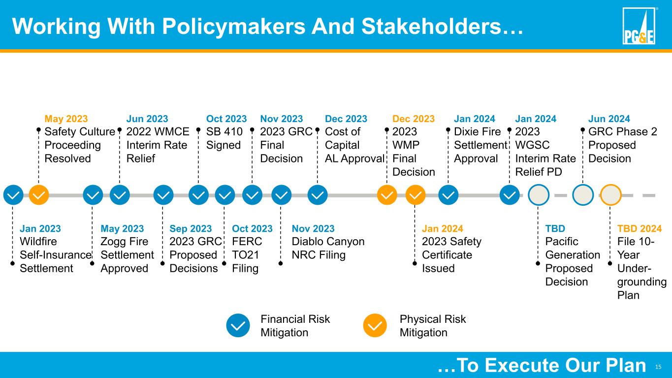 14 Endnotes are included in the Appendix. Simple, Affordable Model… …Creates Room For Customer Capital Investment Examples of O&M Cost Reductions (Non-Fuel) Efficient Financing Sale of Minority Interest in Pac Gen | DOE Loan Program 2022 Actual 2023 Actual 2024 Plan Long-Term Plan Good Business Decisions and Savings Through Lean (millions) (millions) (millions) (millions) - Resource Management $ 25 $ 90 $ 65 $ 65 - Efficiencies & Insurance 270 350 150 50 - Capital Conversion 100 - 5 30 30 - Planning, Execution, and Automation 50 130 155 195 Net Cost Increases (115) (60)6 (200) (140) Net Savings $ 330 $ 510 $ 200 $ 200 Percent Savings MODEL1 PLAN Customer Capital Investment ~9% Enablers -O&M cost reduction (non-fuel)2 2% -Electric load growth3 1% - 3% -Other (including efficient financing)4 2% Subtotal 5% - 7% Customer Bills: At or Below Assumed Inflation 2% - 4% 5½%3% 2% 2%