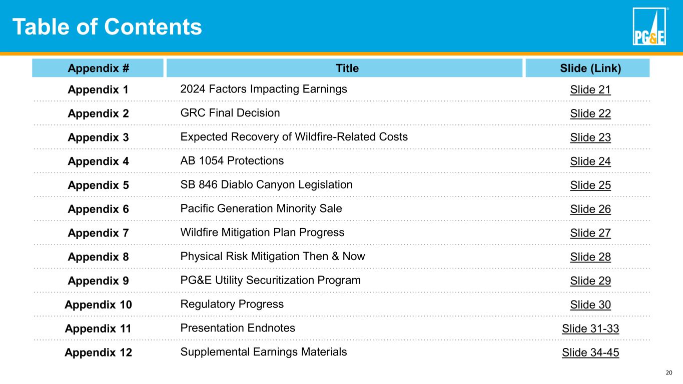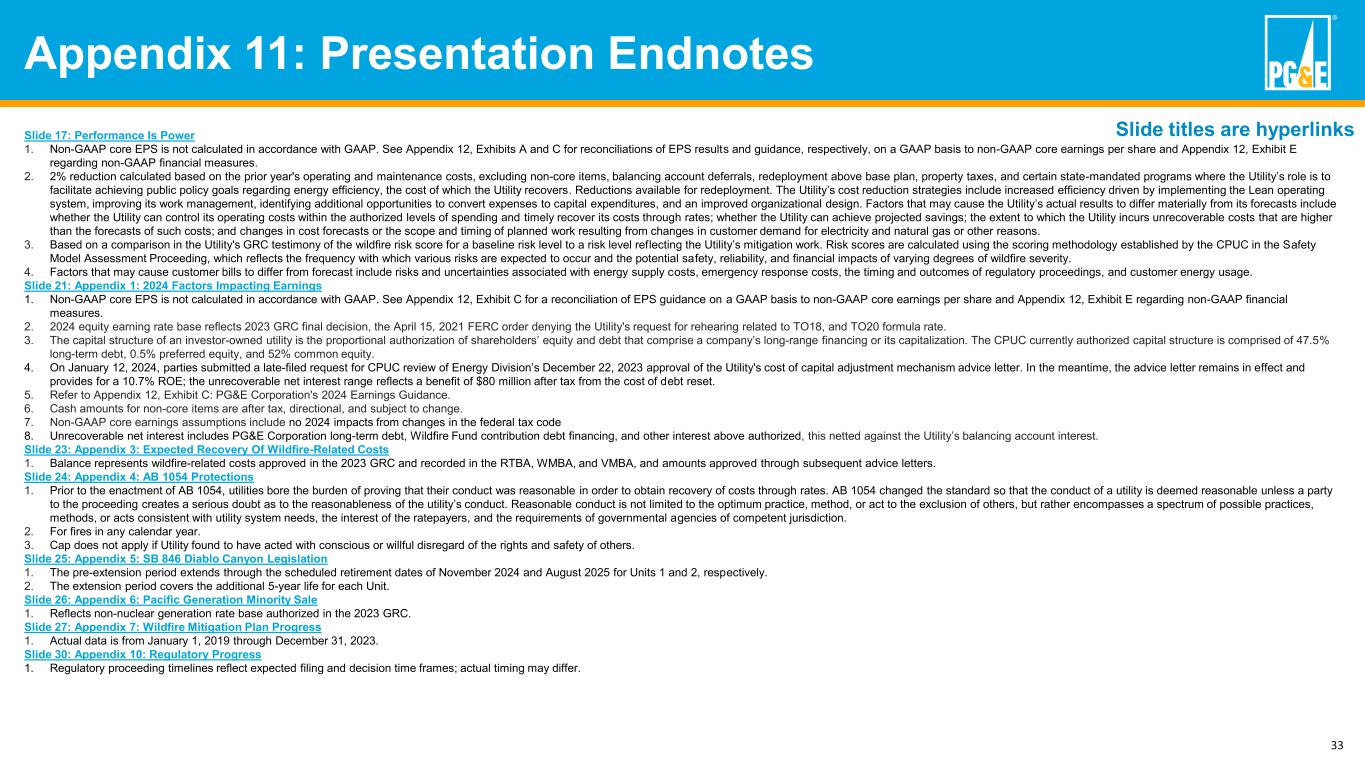 33 Slide titles are hyperlinks Appendix 11: Presentation Endnotes Slide 17: Performance Is Power 1. Non-GAAP core EPS is not calculated in accordance with GAAP. See Appendix 12, Exhibits A and C for reconciliations of EPS results and guidance, respectively, on a GAAP basis to non-GAAP core earnings per share and Appendix 12, Exhibit E regarding non-GAAP financial measures. 2. 2% reduction calculated based on the prior year's operating and maintenance costs, excluding non-core items, balancing account deferrals, redeployment above base plan, property taxes, and certain state-mandated programs where the Utility’s role is to facilitate achieving public policy goals regarding energy efficiency, the cost of which the Utility recovers. Reductions available for redeployment. The Utility’s cost reduction strategies include increased efficiency driven by implementing the Lean operating system, improving its work management, identifying additional opportunities to convert expenses to capital expenditures, and an improved organizational design. Factors that may cause the Utility’s actual results to differ materially from its forecasts include whether the Utility can control its operating costs within the authorized levels of spending and timely recover its costs through rates; whether the Utility can achieve projected savings; the extent to which the Utility incurs unrecoverable costs that are higher than the forecasts of such costs; and changes in cost forecasts or the scope and timing of planned work resulting from changes in customer demand for electricity and natural gas or other reasons. 3. Based on a comparison in the Utility's GRC testimony of the wildfire risk score for a baseline risk level to a risk level reflecting the Utility’s mitigation work. Risk scores are calculated using the scoring methodology established by the CPUC in the Safety Model Assessment Proceeding, which reflects the frequency with which various risks are expected to occur and the potential safety, reliability, and financial impacts of varying degrees of wildfire severity. 4. Factors that may cause customer bills to differ from forecast include risks and uncertainties associated with energy supply costs, emergency response costs, the timing and outcomes of regulatory proceedings, and customer energy usage. Slide 21: Appendix 1: 2024 Factors Impacting Earnings 1. Non-GAAP core EPS is not calculated in accordance with GAAP. See Appendix 12, Exhibit C for a reconciliation of EPS guidance on a GAAP basis to non-GAAP core earnings per share and Appendix 12, Exhibit E regarding non-GAAP financial measures. 2. 2024 equity earning rate base reflects 2023 GRC final decision, the April 15, 2021 FERC order denying the Utility's request for rehearing related to TO18, and TO20 formula rate. 3. The capital structure of an investor-owned utility is the proportional authorization of shareholders’ equity and debt that comprise a company’s long-range financing or its capitalization. The CPUC currently authorized capital structure is comprised of 47.5% long-term debt, 0.5% preferred equity, and 52% common equity. 4. On January 12, 2024, parties submitted a late-filed request for CPUC review of Energy Division’s December 22, 2023 approval of the Utility's cost of capital adjustment mechanism advice letter. In the meantime, the advice letter remains in effect and provides for a 10.7% ROE; the unrecoverable net interest range reflects a benefit of $80 million after tax from the cost of debt reset. 5. Refer to Appendix 12, Exhibit C: PG&E Corporation's 2024 Earnings Guidance. 6. Cash amounts for non-core items are after tax, directional, and subject to change. 7. Non-GAAP core earnings assumptions include no 2024 impacts from changes in the federal tax code 8. Unrecoverable net interest includes PG&E Corporation long-term debt, Wildfire Fund contribution debt financing, and other interest above authorized, this netted against the Utility’s balancing account interest. Slide 23: Appendix 3: Expected Recovery Of Wildfire-Related Costs 1. Balance represents wildfire-related costs approved in the 2023 GRC and recorded in the RTBA, WMBA, and VMBA, and amounts approved through subsequent advice letters. Slide 24: Appendix 4: AB 1054 Protections 1. Prior to the enactment of AB 1054, utilities bore the burden of proving that their conduct was reasonable in order to obtain recovery of costs through rates. AB 1054 changed the standard so that the conduct of a utility is deemed reasonable unless a party to the proceeding creates a serious doubt as to the reasonableness of the utility’s conduct. Reasonable conduct is not limited to the optimum practice, method, or act to the exclusion of others, but rather encompasses a spectrum of possible practices, methods, or acts consistent with utility system needs, the interest of the ratepayers, and the requirements of governmental agencies of competent jurisdiction. 2. For fires in any calendar year. 3. Cap does not apply if Utility found to have acted with conscious or willful disregard of the rights and safety of others. Slide 25: Appendix 5: SB 846 Diablo Canyon Legislation 1. The pre-extension period extends through the scheduled retirement dates of November 2024 and August 2025 for Units 1 and 2, respectively. 2. The extension period covers the additional 5-year life for each Unit. Slide 26: Appendix 6: Pacific Generation Minority Sale 1. Reflects non-nuclear generation rate base authorized in the 2023 GRC. Slide 27: Appendix 7: Wildfire Mitigation Plan Progress 1. Actual data is from January 1, 2019 through December 31, 2023. Slide 30: Appendix 10: Regulatory Progress 1. Regulatory proceeding timelines reflect expected filing and decision time frames; actual timing may differ.