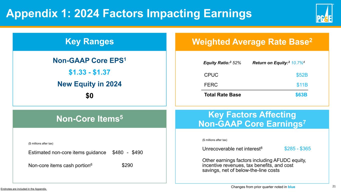 20 Table of Contents Appendix # Title Slide (Link) Appendix 1 2024 Factors Impacting Earnings Slide 21 Appendix 2 GRC Final Decision Slide 22 Appendix 3 Expected Recovery of Wildfire-Related Costs Slide 23 Appendix 4 AB 1054 Protections Slide 24 Appendix 5 SB 846 Diablo Canyon Legislation Slide 25 Appendix 6 Pacific Generation Minority Sale Slide 26 Appendix 7 Wildfire Mitigation Plan Progress Slide 27 Appendix 8 Physical Risk Mitigation Then & Now Slide 28 Appendix 9 PG&E Utility Securitization Program Slide 29 Appendix 10 Regulatory Progress Slide 30 Appendix 11 Presentation Endnotes Slide 31-33 Appendix 12 Supplemental Earnings Materials Slide 34-45