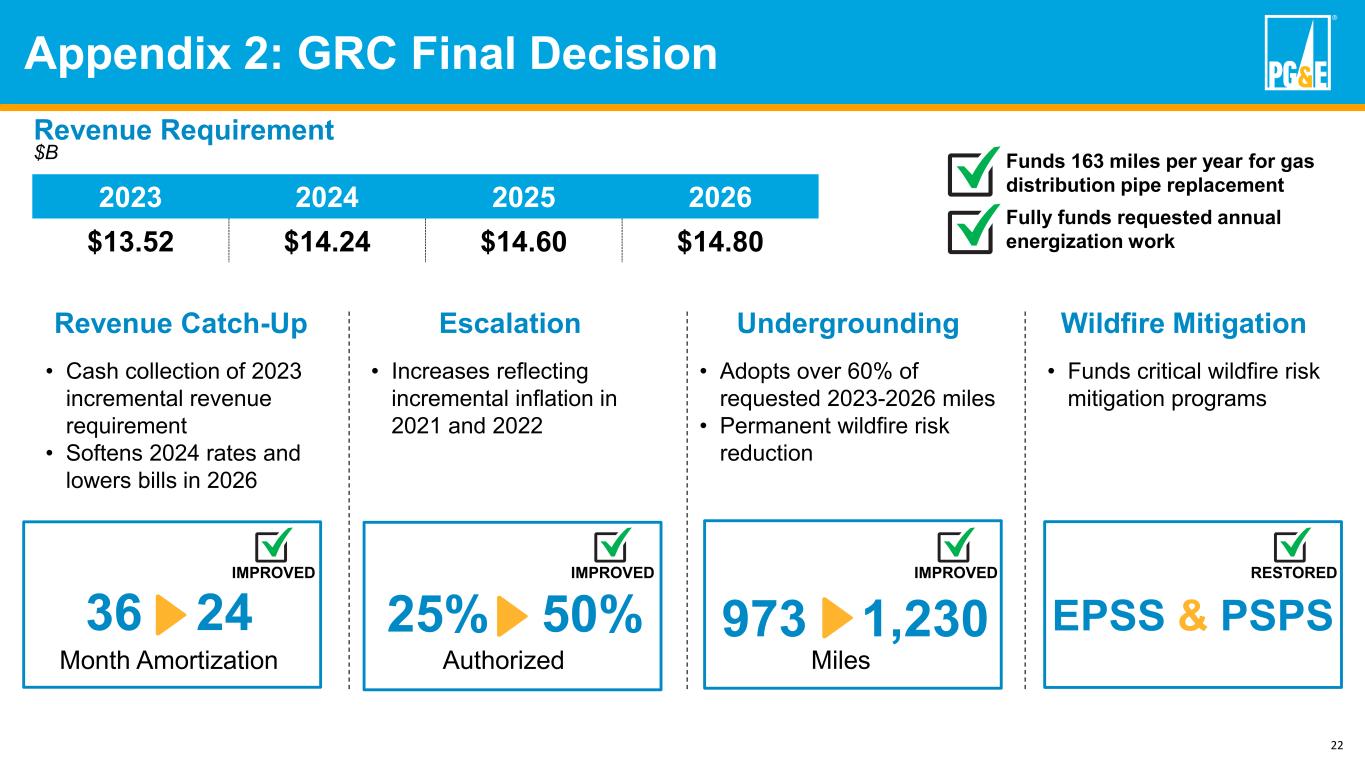 22 Appendix 2: GRC Final Decision 2023 2024 2025 2026 $13.52 $14.24 $14.60 $14.80 Revenue Catch-Up • Cash collection of 2023 incremental revenue requirement • Softens 2024 rates and lowers bills in 2026 Escalation • Increases reflecting incremental inflation in 2021 and 2022 Undergrounding • Adopts over 60% of requested 2023-2026 miles • Permanent wildfire risk reduction Wildfire Mitigation • Funds critical wildfire risk mitigation programs Authorized Miles EPSS & PSPS Month Amortization Funds 163 miles per year for gas distribution pipe replacement Fully funds requested annual energization work Revenue Requirement $B IMPROVED 36 24 25% 50% IMPROVED IMPROVED 973 1,230 RESTORED
