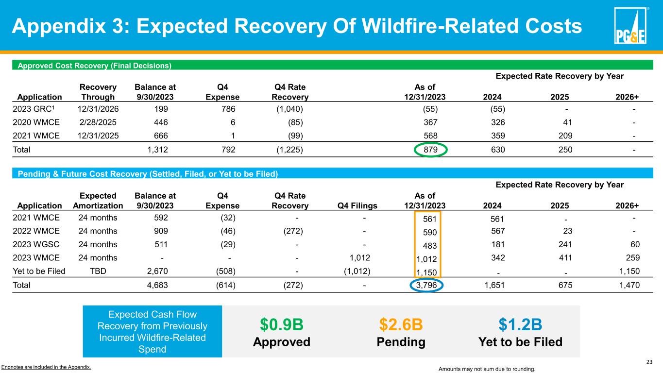 23 Endnotes are included in the Appendix. Appendix 3: Expected Recovery Of Wildfire-Related Costs Amounts may not sum due to rounding. Approved Cost Recovery (Final Decisions) Expected Rate Recovery by Year Application Recovery Through Balance at 9/30/2023 Q4 Expense Q4 Rate Recovery As of 12/31/2023 2024 2025 2026+ 2023 GRC1 12/31/2026 199 786 (1,040) (55) (55) - - 2020 WMCE 2/28/2025 446 6 (85) 367 326 41 - 2021 WMCE 12/31/2025 666 1 (99) 568 359 209 - Total 1,312 792 (1,225) 879 630 250 - Pending & Future Cost Recovery (Settled, Filed, or Yet to be Filed) Expected Rate Recovery by Year Application Expected Amortization Balance at 9/30/2023 Q4 Expense Q4 Rate Recovery Q4 Filings As of 12/31/2023 2024 2025 2026+ 2021 WMCE 24 months 592 (32) - - 561 561 - - 2022 WMCE 24 months 909 (46) (272) - 590 567 23 - 2023 WGSC 24 months 511 (29) - - 483 181 241 60 2023 WMCE 24 months - - - 1,012 1,012 342 411 259 Yet to be Filed TBD 2,670 (508) - (1,012) 1,150 - - 1,150 Total 4,683 (614) (272) - 3,796 1,651 675 1,470 Expected Cash Flow Recovery from Previously Incurred Wildfire-Related Spend $0.9B Approved $2.6B Pending $1.2B Yet to be Filed