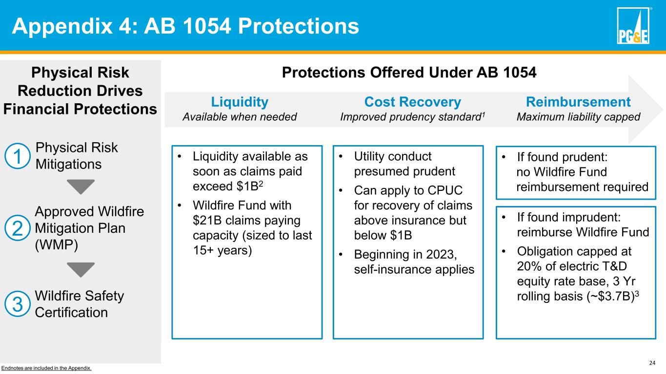 24 Endnotes are included in the Appendix. Protections Offered Under AB 1054 Appendix 4: AB 1054 Protections Physical Risk Reduction Drives Financial Protections • Liquidity available as soon as claims paid exceed $1B2 • Wildfire Fund with $21B claims paying capacity (sized to last 15+ years) Liquidity Available when needed Cost Recovery Improved prudency standard1 Reimbursement Maximum liability capped • Utility conduct presumed prudent • Can apply to CPUC for recovery of claims above insurance but below $1B • Beginning in 2023, self-insurance applies • If found imprudent: reimburse Wildfire Fund • Obligation capped at 20% of electric T&D equity rate base, 3 Yr rolling basis (~$3.7B)3 • If found prudent: no Wildfire Fund reimbursement required Physical Risk Mitigations1 Approved Wildfire Mitigation Plan (WMP) 2 Wildfire Safety Certification3