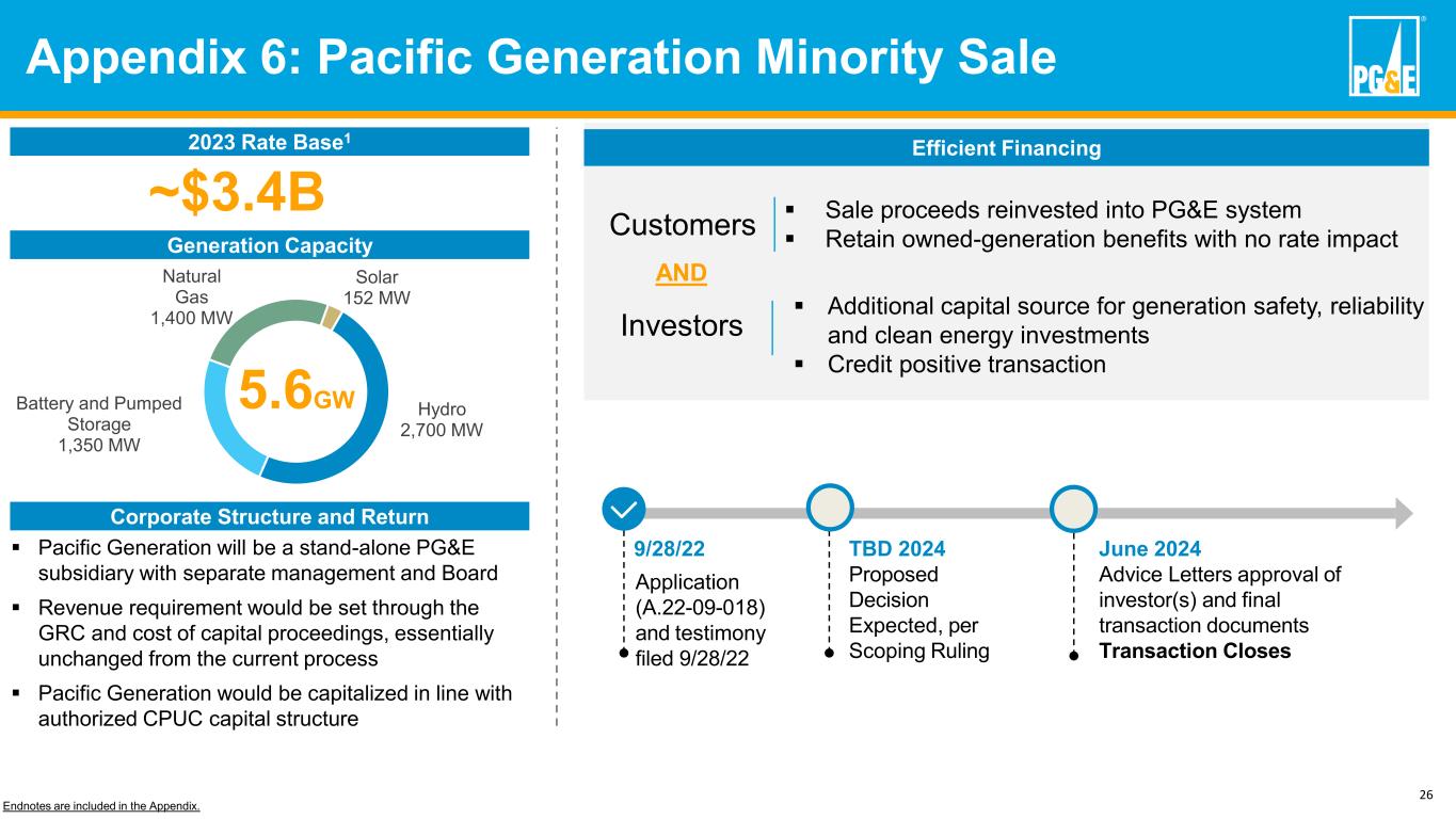 25 Endnotes are included in the Appendix. Cost Recovery 2022-20241 2025-20302 ▪ Ongoing O&M and rate base recovery through the GRC ▪ $1.4B in state funding available to support extended operations ▪ $1.1B in extension costs; to be reimbursed from DOE Civil Nuclear Credit program ▪ Up to $300M available to invest in business through a $7/MWh transition fee starting 9/2/22 ▪ $100M/year in lieu of traditional rate base return ▪ Annual automatic true-up mechanism for costs ▪ $13/MWh performance fee upside to be deployed for customer benefit Pre-Extension Period Extension Period Appendix 5: SB 846 Diablo Canyon Legislation 9/2/22 Governor Newsom signed SB 846 1/11/24 Finalized terms with DOE for up to $1.1B via the Civil Nuclear Credit Program 10/18/22 Executed $1.4B loan agreement with DWR 3/2/23 NRC approved exemption request allowing continued operations at DCPP 11/7/23 Filed for NRC license renewal 12/14/23 CPUC final decision conditionally approving extended operations 12/19/23 NRC determined license renewal application sufficient TBD NRC Environmental Impact Statement & Safety Evaluation Report