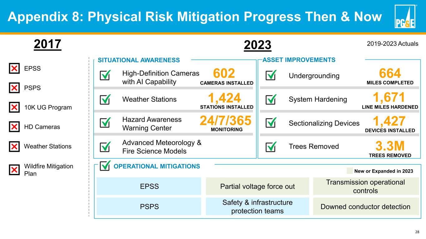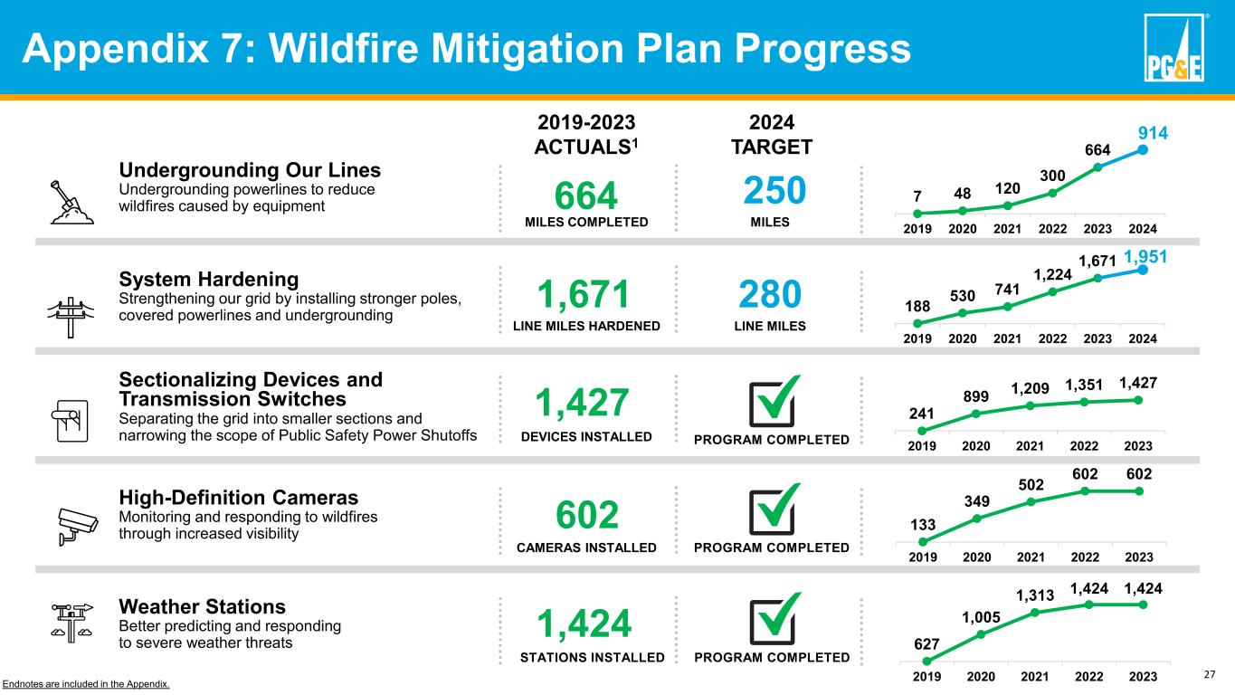 27 Endnotes are included in the Appendix. Appendix 7: Wildfire Mitigation Plan Progress Undergrounding Our Lines Undergrounding powerlines to reduce wildfires caused by equipment System Hardening Strengthening our grid by installing stronger poles, covered powerlines and undergrounding Sectionalizing Devices and Transmission Switches Separating the grid into smaller sections and narrowing the scope of Public Safety Power Shutoffs High-Definition Cameras Monitoring and responding to wildfires through increased visibility Weather Stations Better predicting and responding to severe weather threats 7 48 120 300 664 2019 2020 2021 2022 2023 2024 914 188 530 741 1,224 1,671 2019 2020 2021 2022 2023 2024 1,951 241 899 1,209 1,351 1,427 2019 2020 2021 2022 2023 133 349 502 602 602 2019 2020 2021 2022 2023 627 1,005 1,313 1,424 1,424 2019 2020 2021 2022 2023 2019-2023 ACTUALS1 STATIONS INSTALLED 1,424 CAMERAS INSTALLED 602 DEVICES INSTALLED 1,427 LINE MILES HARDENED 1,671 MILES COMPLETED 664 2024 TARGET MILES 250 LINE MILES 280 PROGRAM COMPLETED PROGRAM COMPLETED PROGRAM COMPLETED