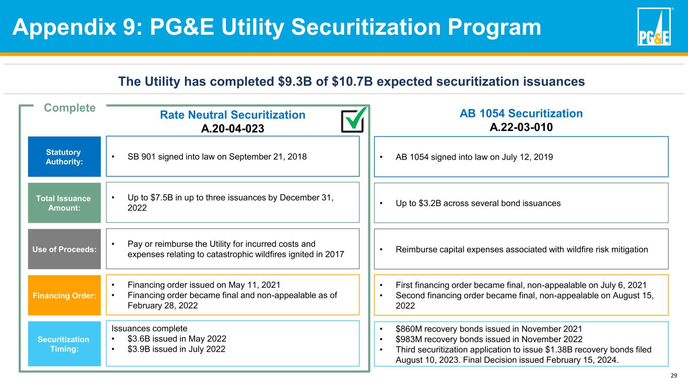 29 The Utility has completed $9.3B of $10.7B expected securitization issuances • AB 1054 signed into law on July 12, 2019 • Up to $3.2B across several bond issuances • Reimburse capital expenses associated with wildfire risk mitigation • First financing order became final, non-appealable on July 6, 2021 • Second financing order became final, non-appealable on August 15, 2022 • $860M recovery bonds issued in November 2021 • $983M recovery bonds issued in November 2022 • Third securitization application to issue $1.38B recovery bonds filed August 10, 2023. Final Decision issued February 15, 2024. • SB 901 signed into law on September 21, 2018 • Up to $7.5B in up to three issuances by December 31, 2022 • Pay or reimburse the Utility for incurred costs and expenses relating to catastrophic wildfires ignited in 2017 • Financing order issued on May 11, 2021 • Financing order became final and non-appealable as of February 28, 2022 Issuances complete • $3.6B issued in May 2022 • $3.9B issued in July 2022 Statutory Authority: Total Issuance Amount: Use of Proceeds: Financing Order: Securitization Timing: Rate Neutral Securitization A.20-04-023 AB 1054 Securitization A.22-03-010 Complete Appendix 9: PG&E Utility Securitization Program