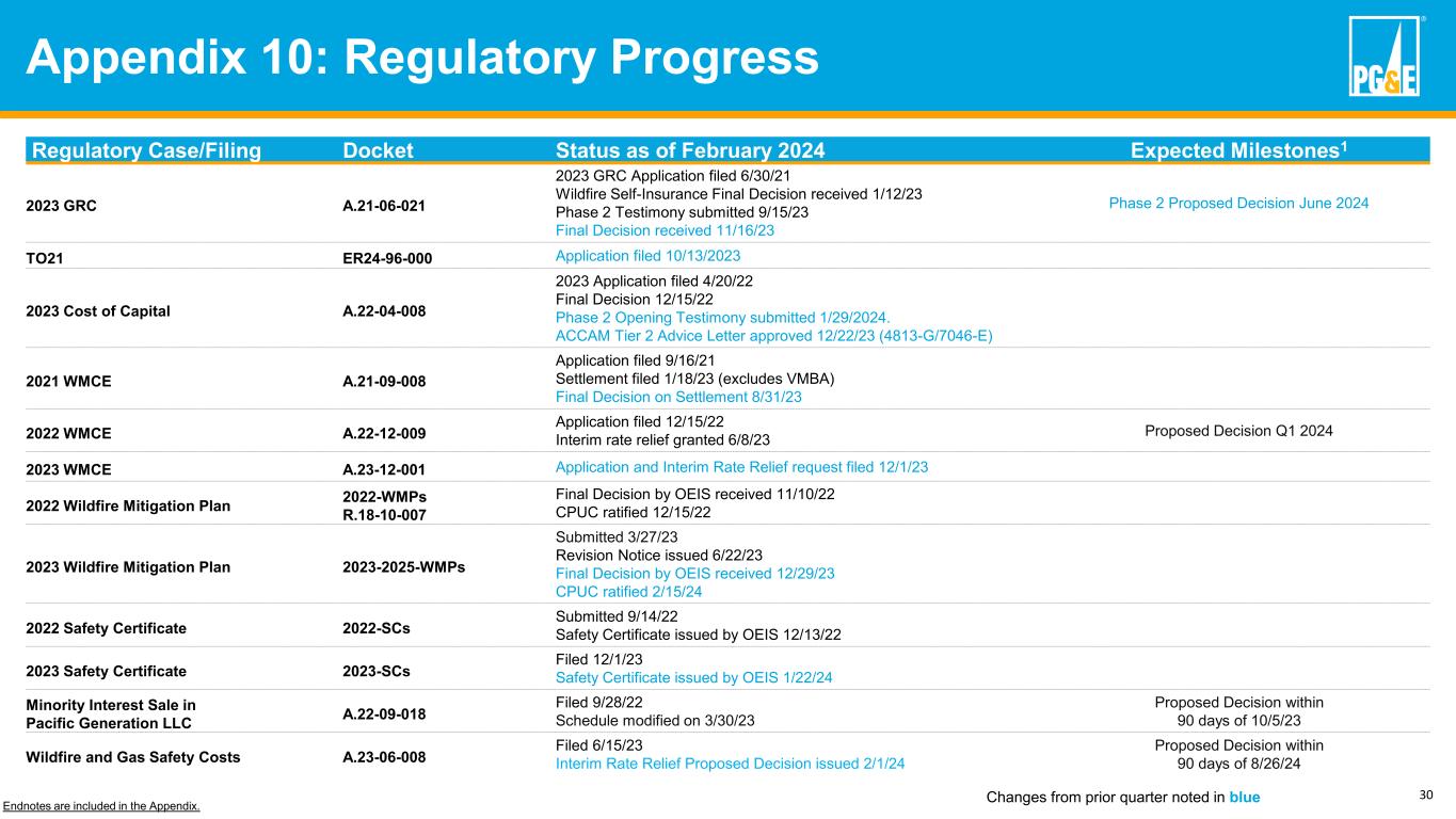 30 Endnotes are included in the Appendix. Changes from prior quarter noted in blue Regulatory Case/Filing Docket Status as of February 2024 Expected Milestones1 2023 GRC A.21-06-021 2023 GRC Application filed 6/30/21 Wildfire Self-Insurance Final Decision received 1/12/23 Phase 2 Testimony submitted 9/15/23 Final Decision received 11/16/23 Phase 2 Proposed Decision June 2024 TO21 ER24-96-000 Application filed 10/13/2023 2023 Cost of Capital A.22-04-008 2023 Application filed 4/20/22 Final Decision 12/15/22 Phase 2 Opening Testimony submitted 1/29/2024. ACCAM Tier 2 Advice Letter approved 12/22/23 (4813-G/7046-E) 2021 WMCE A.21-09-008 Application filed 9/16/21 Settlement filed 1/18/23 (excludes VMBA) Final Decision on Settlement 8/31/23 2022 WMCE A.22-12-009 Application filed 12/15/22 Interim rate relief granted 6/8/23 Proposed Decision Q1 2024 2023 WMCE A.23-12-001 Application and Interim Rate Relief request filed 12/1/23 2022 Wildfire Mitigation Plan 2022-WMPs R.18-10-007 Final Decision by OEIS received 11/10/22 CPUC ratified 12/15/22 2023 Wildfire Mitigation Plan 2023-2025-WMPs Submitted 3/27/23 Revision Notice issued 6/22/23 Final Decision by OEIS received 12/29/23 CPUC ratified 2/15/24 2022 Safety Certificate 2022-SCs Submitted 9/14/22 Safety Certificate issued by OEIS 12/13/22 2023 Safety Certificate 2023-SCs Filed 12/1/23 Safety Certificate issued by OEIS 1/22/24 Minority Interest Sale in Pacific Generation LLC A.22-09-018 Filed 9/28/22 Schedule modified on 3/30/23 Proposed Decision within 90 days of 10/5/23 Wildfire and Gas Safety Costs A.23-06-008 Filed 6/15/23 Interim Rate Relief Proposed Decision issued 2/1/24 Proposed Decision within 90 days of 8/26/24 Appendix 10: Regulatory Progress