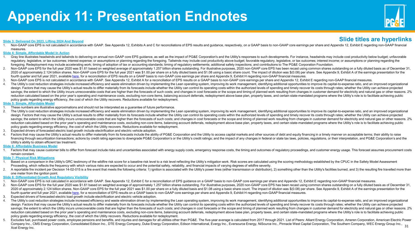 31 Slide titles are hyperlinksSlide 3: Delivered On 2023, Lifting 2024 And Beyond 1. Non-GAAP core EPS is not calculated in accordance with GAAP. See Appendix 12, Exhibits A and C for reconciliations of EPS results and guidance, respectively, on a GAAP basis to non-GAAP core earnings per share and Appendix 12, Exhibit E regarding non-GAAP financial measures. Slide 4: Simple, Affordable Model In Action 1. Gray line illustrates headwinds and tailwinds to delivering on annual non-GAAP core EPS guidance, as well as the impact of PG&E Corporation's and the Utility's responses to such developments. For instance, headwinds may include cost productivity below budget; unfavorable regulatory, legislative, or tax outcomes; interest expense; or assumptions or planning regarding the foregoing. Tailwinds may include cost productivity above budget; favorable regulatory, legislative, or tax outcomes; interest income; or assumptions or planning regarding the foregoing. Redeployment may include accelerating work; timing of adoption of tax or accounting standards; timing of regulatory settlements; additional safety inspections; and contributions to The PG&E Corporation Foundation. 2. Non-GAAP core EPS for the full year 2020 was $1.61 based on weighted average of approximately 1.257 billion shares outstanding. For illustrative purposes, 2020 non-GAAP core EPS has been recast using common shares outstanding on a fully diluted basis as of December 31, 2020 of approximately 2.124 billion shares. Non-GAAP core EPS for the full year 2021 was $1.00 per share on a fully diluted basis and $1.08 using a basic share count. The impact of dilution was $(0.08) per share. See Appendix 9, Exhibit A of the earnings presentation for the fourth quarter and full year 2021, available here, for a reconciliation of EPS results on a GAAP basis to non-GAAP core earnings per share and Appendix 9, Exhibit H regarding non-GAAP financial measures. 3. Non-GAAP core EPS is not calculated in accordance with GAAP. See Appendix 12, Exhibit A for a reconciliation of EPS results on a GAAP basis to non-GAAP core earnings per share and Appendix 12, Exhibit E regarding non-GAAP financial measures. 4. The Utility’s cost reduction strategies include increased efficiency and waste elimination driven by implementing the Lean operating system, improving its work management, identifying additional opportunities to improve its capital-to-expense ratio, and an improved organizational design. Factors that may cause the Utility’s actual results to differ materially from its forecasts include whether the Utility can control its operating costs within the authorized levels of spending and timely recover its costs through rates; whether the Utility can achieve projected savings; the extent to which the Utility incurs unrecoverable costs that are higher than the forecasts of such costs; and changes in cost forecasts or the scope and timing of planned work resulting from changes in customer demand for electricity and natural gas or other reasons. 2% reduction calculated based on the prior year’s operating and maintenance costs, excluding non-core items, balancing account deferrals, redeployment above base plan, property taxes, and certain state-mandated programs where the Utility’s role is to facilitate achieving public policy goals regarding energy efficiency, the cost of which the Utility recovers. Reductions available for redeployment. Slide 5: Simple, Affordable Model 1. These numbers are illustrative approximations and should not be interpreted as a guarantee of future performance. 2. The Utility’s cost reduction strategies include increased efficiency and waste elimination driven by implementing the Lean operating system, improving its work management, identifying additional opportunities to improve its capital-to-expense ratio, and an improved organizational design. Factors that may cause the Utility’s actual results to differ materially from its forecasts include whether the Utility can control its operating costs within the authorized levels of spending and timely recover its costs through rates; whether the Utility can achieve projected savings; the extent to which the Utility incurs unrecoverable costs that are higher than the forecasts of such costs; and changes in cost forecasts or the scope and timing of planned work resulting from changes in customer demand for electricity and natural gas or other reasons. 2% reduction calculated based on the prior year’s operating and maintenance costs, excluding non-core items, balancing account deferrals, redeployment above base plan, property taxes, and certain state-mandated programs where the Utility’s role is to facilitate achieving public policy goals regarding energy efficiency, the cost of which the Utility recovers. Reductions available for redeployment. 3. Expected drivers of forecasted electric load growth include electrification and electric vehicle adoption. 4. Factors that may cause the Utility’s actual results to differ materially from its forecasts include the ability of PG&E Corporation and the Utility to access capital markets and other sources of debt and equity financing in a timely manner on acceptable terms; their ability to raise financing through securitization transactions; actions by credit rating agencies to downgrade PG&E Corporation’s or the Utility’s credit ratings; and the impact of any changes in federal or state tax laws, policies, regulations, or their interpretation, and PG&E Corporation’s and the Utility’s ability to obtain efficient tax treatment. Slide 6: Affordable Business Model 1. Factors that may cause customer bills to differ from forecast include risks and uncertainties associated with energy supply costs, emergency response costs, the timing and outcomes of regulatory proceedings, and customer energy usage. This forecast assumes procurement costs remain constant. Slide 7: Physical Risk Mitigations 1. Based on a comparison in the Utility's 