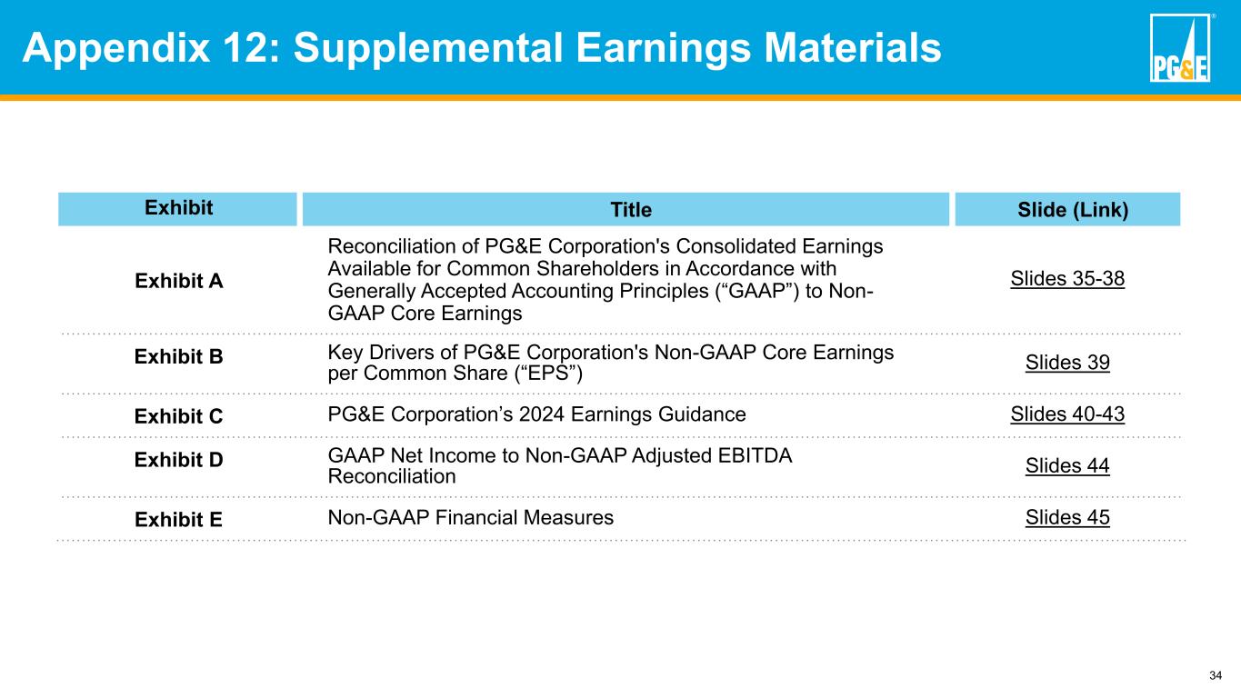 34 Appendix 12: Supplemental Earnings Materials Exhibit Title Slide (Link) Exhibit A Reconciliation of PG&E Corporation's Consolidated Earnings Available for Common Shareholders in Accordance with Generally Accepted Accounting Principles (“GAAP”) to Non- GAAP Core Earnings Slides 35-38 Exhibit B Key Drivers of PG&E Corporation's Non-GAAP Core Earnings per Common Share (“EPS”) Slides 39 Exhibit C PG&E Corporation’s 2024 Earnings Guidance Slides 40-43 Exhibit D GAAP Net Income to Non-GAAP Adjusted EBITDA Reconciliation Slides 44 Exhibit E Non-GAAP Financial Measures Slides 45
