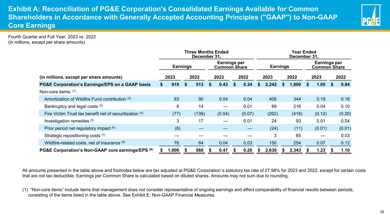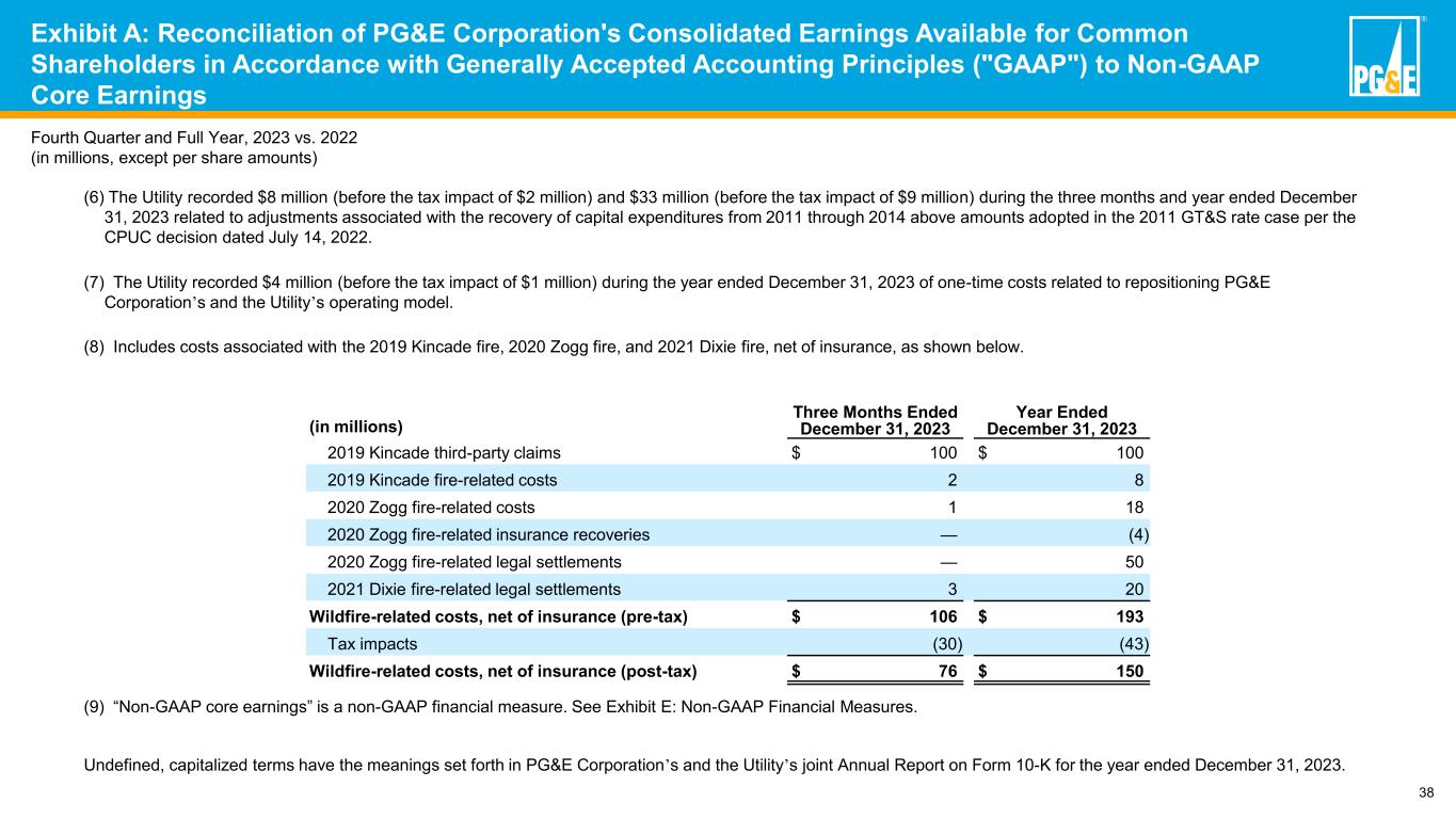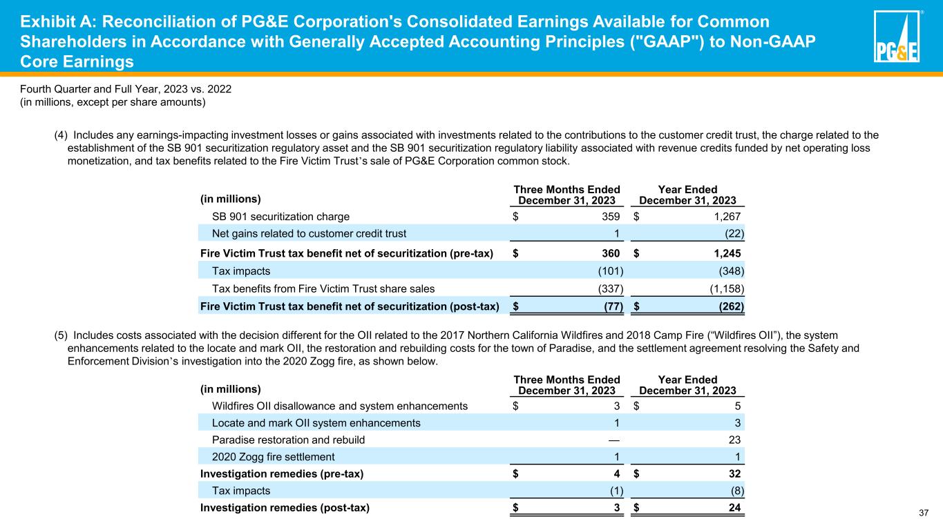 37 Fourth Quarter and Full Year, 2023 vs. 2022 (in millions, except per share amounts) (4) Includes any earnings-impacting investment losses or gains associated with investments related to the contributions to the customer credit trust, the charge related to the establishment of the SB 901 securitization regulatory asset and the SB 901 securitization regulatory liability associated with revenue credits funded by net operating loss monetization, and tax benefits related to the Fire Victim Trust’s sale of PG&E Corporation common stock. (in millions) Three Months Ended December 31, 2023 Year Ended December 31, 2023 Wildfires OII disallowance and system enhancements $ 3 $ 5 Locate and mark OII system enhancements 1 3 Paradise restoration and rebuild — 23 2020 Zogg fire settlement 1 1 Investigation remedies (pre-tax) $ 4 $ 32 Tax impacts (1) (8) Investigation remedies (post-tax) $ 3 $ 24 (5) Includes costs associated with the decision different for the OII related to the 2017 Northern California Wildfires and 2018 Camp Fire (“Wildfires OII”), the system enhancements related to the locate and mark OII, the restoration and rebuilding costs for the town of Paradise, and the settlement agreement resolving the Safety and Enforcement Division’s investigation into the 2020 Zogg fire, as shown below. (in millions) Three Months Ended December 31, 2023 Year Ended December 31, 2023 SB 901 securitization charge $ 359 $ 1,267 Net gains related to customer credit trust 1 (22) Fire Victim Trust tax benefit net of securitization (pre-tax) $ 360 $ 1,245 Tax impacts (101) (348) Tax benefits from Fire Victim Trust share sales (337) (1,158) Fire Victim Trust tax benefit net of securitization (post-tax) $ (77) $ (262) Exhibit A: Reconciliation of PG&E Corporation's Consolidated Earnings Available for Common Shareholders in Accordance with Generally Accepted Accounting Principles ("GAAP") to Non-GAAP Core Earnings