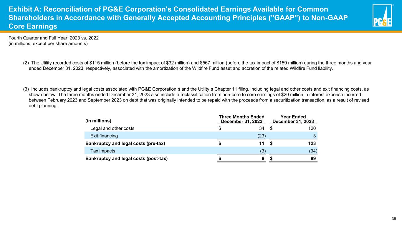 35 Exhibit A: Reconciliation of PG&E Corporation's Consolidated Earnings Available for Common Shareholders in Accordance with Generally Accepted Accounting Principles ("GAAP") to Non-GAAP Core Earnings Three Months Ended December 31, Year Ended December 31, Earnings Earnings per Common Share Earnings Earnings per Common Share (in millions, except per share amounts) 2023 2022 2023 2022 2023 2022 2023 2022 PG&E Corporation’s Earnings/EPS on a GAAP basis $ 919 $ 513 $ 0.43 $ 0.24 $ 2,242 $ 1,800 $ 1.05 $ 0.84 Non-core items: (1) Amortization of Wildfire Fund contribution (2) 83 90 0.04 0.04 408 344 0.19 0.16 Bankruptcy and legal costs (3) 8 14 — 0.01 89 216 0.04 0.10 Fire Victim Trust tax benefit net of securitization (4) (77) (139) (0.04) (0.07) (262) (418) (0.12) (0.20) Investigation remedies (5) 3 17 — 0.01 24 93 0.01 0.04 Prior period net regulatory impact (6) (6) — — — (24) (11) (0.01) (0.01) Strategic repositioning costs (7) — — — — 3 65 — 0.03 Wildfire-related costs, net of insurance (8) 76 64 0.04 0.03 150 254 0.07 0.12 PG&E Corporation’s Non-GAAP core earnings/EPS (9) $ 1,006 $ 560 $ 0.47 $ 0.26 $ 2,630 $ 2,343 $ 1.23 $ 1.10 All amounts presented in the table above and footnotes below are tax adjusted at PG&E Corporation’s statutory tax rate of 27.98% for 2023 and 2022, except for certain costs that are not tax deductible. Earnings per Common Share is calculated based on diluted shares. Amounts may not sum due to rounding. Fourth Quarter and Full Year, 2023 vs. 2022 (in millions, except per share amounts) (1) “Non-core items” include items that management does not consider representative of ongoing earnings and affect comparability of financial results between periods, consisting of the items listed in the table above. See Exhibit E: Non-GAAP Financial Measures.