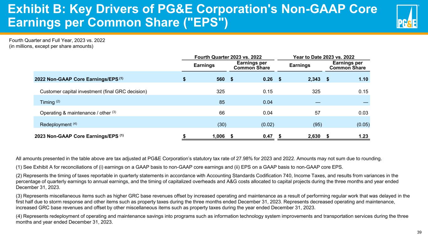 38 Fourth Quarter and Full Year, 2023 vs. 2022 (in millions, except per share amounts) (9) “Non-GAAP core earnings” is a non-GAAP financial measure. See Exhibit E: Non-GAAP Financial Measures. Undefined, capitalized terms have the meanings set forth in PG&E Corporation’s and the Utility’s joint Annual Report on Form 10-K for the year ended December 31, 2023. (8) Includes costs associated with the 2019 Kincade fire, 2020 Zogg fire, and 2021 Dixie fire, net of insurance, as shown below. (in millions) Three Months Ended December 31, 2023 Year Ended December 31, 2023 2019 Kincade third-party claims $ 100 $ 100 2019 Kincade fire-related costs 2 8 2020 Zogg fire-related costs 1 18 2020 Zogg fire-related insurance recoveries — (4) 2020 Zogg fire-related legal settlements — 50 2021 Dixie fire-related legal settlements 3 20 Wildfire-related costs, net of insurance (pre-tax) $ 106 $ 193 Tax impacts (30) (43) Wildfire-related costs, net of insurance (post-tax) $ 76 $ 150 Exhibit A: Reconciliation of PG&E Corporation's Consolidated Earnings Available for Common Shareholders in Accordance with Generally Accepted Accounting Principles ("GAAP") to Non-GAAP Core Earnings (6) The Utility recorded $8 million (before the tax impact of $2 million) and $33 million (before the tax impact of $9 million) during the three months and year ended December 31, 2023 related to adjustments associated with the recovery of capital expenditures from 2011 through 2014 above amounts adopted in the 2011 GT&S rate case per the CPUC decision dated July 14, 2022. (7) The Utility recorded $4 million (before the tax impact of $1 million) during the year ended December 31, 2023 of one-time costs related to repositioning PG&E Corporation’s and the Utility’s operating model.