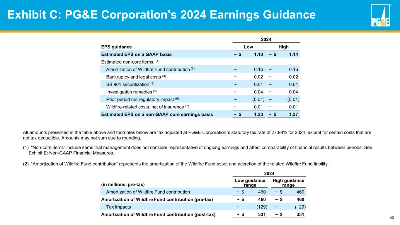 40 2024 EPS guidance Low High Estimated EPS on a GAAP basis ~ $ 1.10 ~ $ 1.14 Estimated non-core items: (1) Amortization of Wildfire Fund contribution (2) ~ 0.16 ~ 0.16 Bankruptcy and legal costs (3) ~ 0.02 ~ 0.02 SB 901 securitization (4) ~ 0.01 ~ 0.01 Investigation remedies (5) ~ 0.04 ~ 0.04 Prior period net regulatory impact (6) ~ (0.01) ~ (0.01) Wildfire-related costs, net of insurance (7) ~ 0.01 ~ 0.01 Estimated EPS on a non-GAAP core earnings basis ~ $ 1.33 ~ $ 1.37 All amounts presented in the table above and footnotes below are tax adjusted at PG&E Corporation’s statutory tax rate of 27.98% for 2024, except for certain costs that are not tax deductible. Amounts may not sum due to rounding. (1) “Non-core items” include items that management does not consider representative of ongoing earnings and affect comparability of financial results between periods. See Exhibit E: Non-GAAP Financial Measures. 2024 (in millions, pre-tax) Low guidance range High guidance range Amortization of Wildfire Fund contribution ~ $ 460 ~ $ 460 Amortization of Wildfire Fund contribution (pre-tax) ~ $ 460 ~ $ 460 Tax impacts ~ (129) ~ (129) Amortization of Wildfire Fund contribution (post-tax) ~ $ 331 ~ $ 331 (2) “Amortization of Wildfire Fund contribution” represents the amortization of the Wildfire Fund asset and accretion of the related Wildfire Fund liability. Exhibit C: PG&E Corporation's 2024 Earnings Guidance