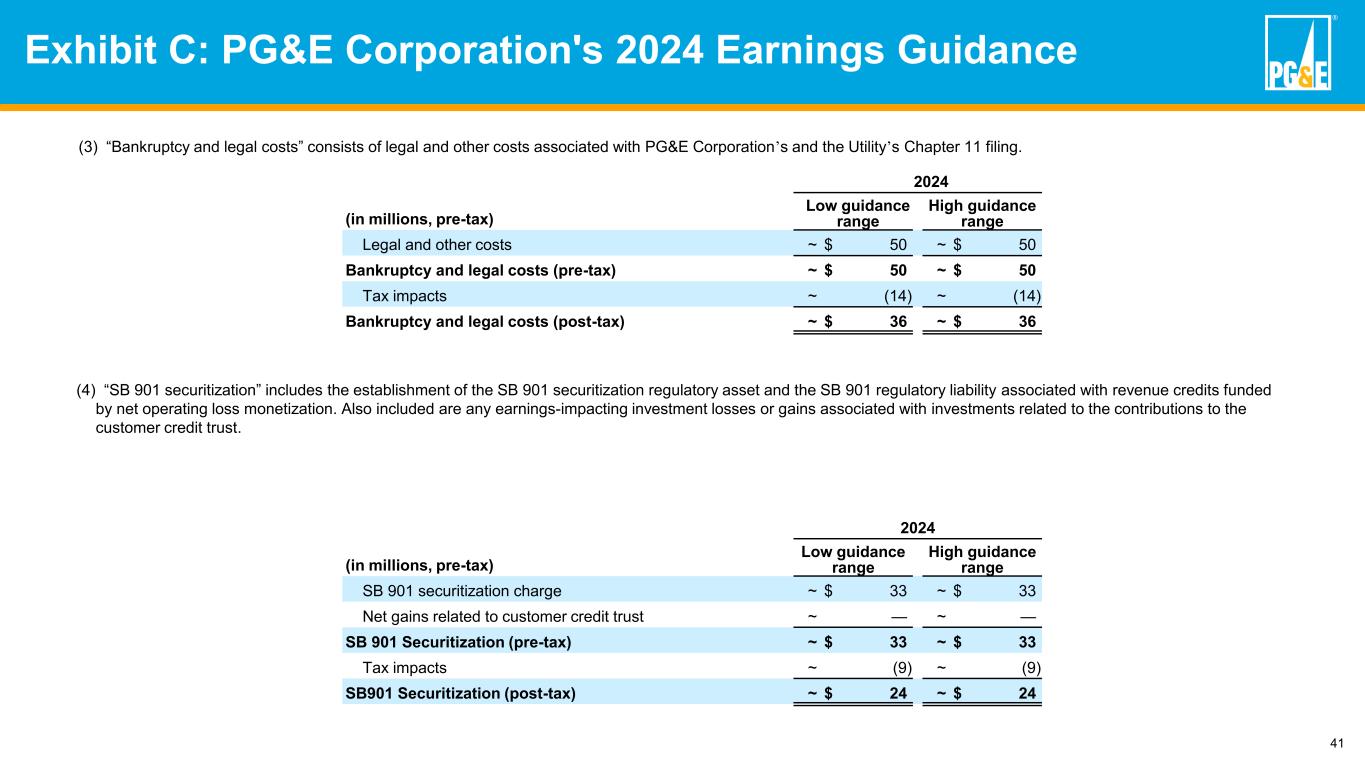 41 Exhibit E: PG&E Corporation's 2020 and 2021 Earnings Guidance (4) “SB 901 securitization” includes the establishment of the SB 901 securitization regulatory asset and the SB 901 regulatory liability associated with revenue credits funded by net operating loss monetization. Also included are any earnings-impacting investment losses or gains associated with investments related to the contributions to the customer credit trust. (3) “Bankruptcy and legal costs” consists of legal and other costs associated with PG&E Corporation’s and the Utility’s Chapter 11 filing. 2024 (in millions, pre-tax) Low guidance range High guidance range Legal and other costs ~ $ 50 ~ $ 50 Bankruptcy and legal costs (pre-tax) ~ $ 50 ~ $ 50 Tax impacts ~ (14) ~ (14) Bankruptcy and legal costs (post-tax) ~ $ 36 ~ $ 36 2024 (in millions, pre-tax) Low guidance range High guidance range SB 901 securitization charge ~ $ 33 ~ $ 33 Net gains related to customer credit trust ~ — ~ — SB 901 Securitization (pre-tax) ~ $ 33 ~ $ 33 Tax impacts ~ (9) ~ (9) SB901 Securitization (post-tax) ~ $ 24 ~ $ 24 Exhibit C: PG&E Corporation's 2024 Earnings Guidance