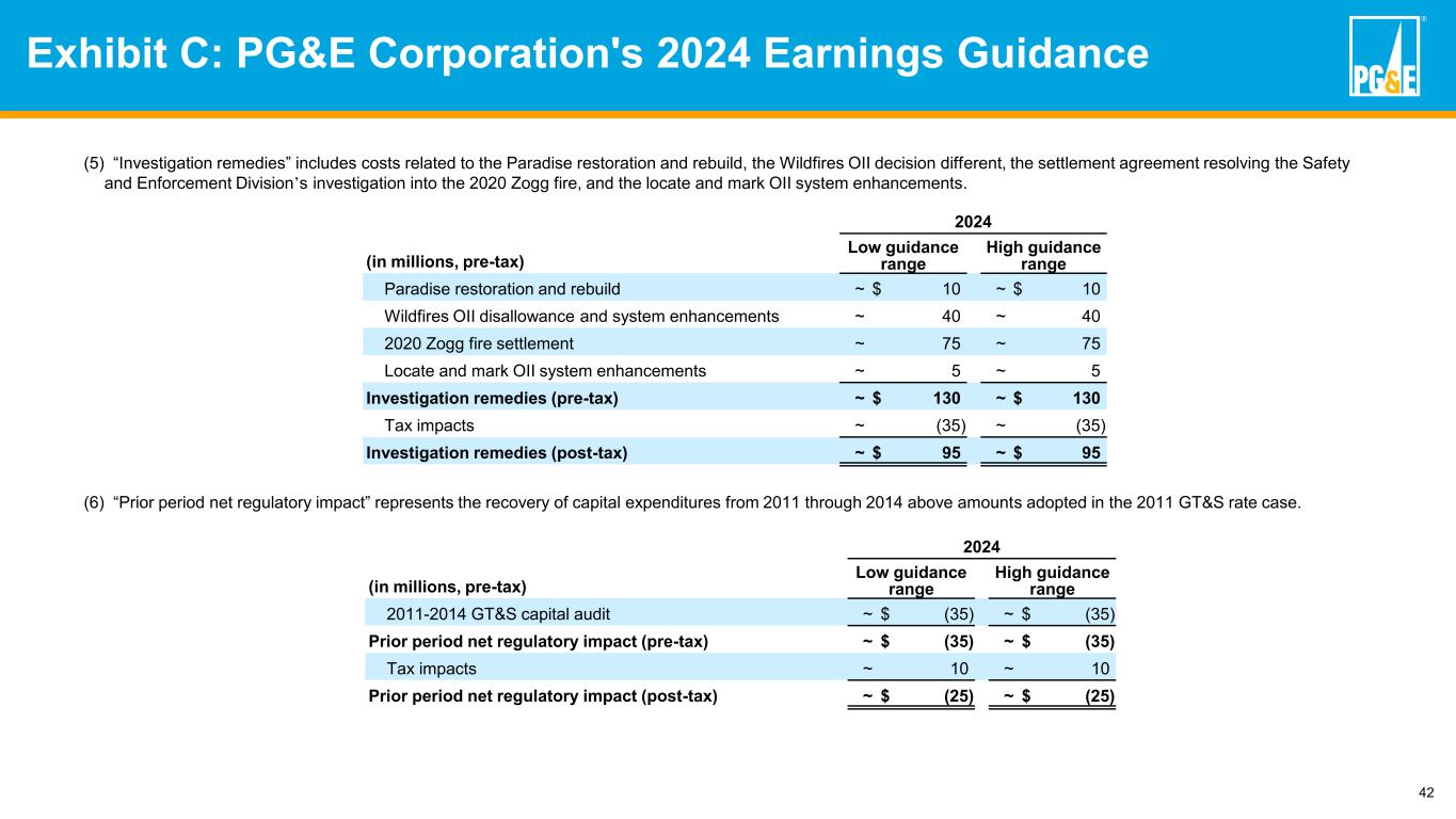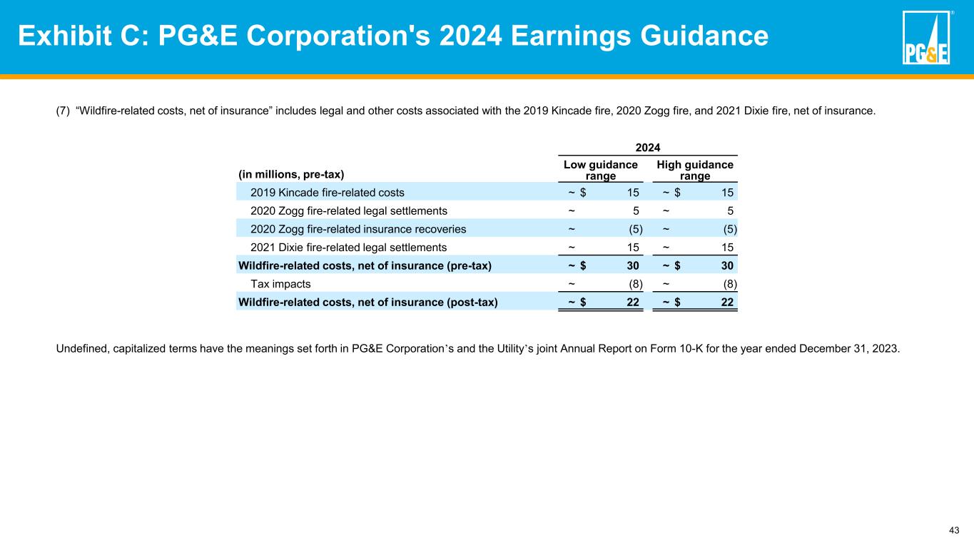 42 (6) “Prior period net regulatory impact” represents the recovery of capital expenditures from 2011 through 2014 above amounts adopted in the 2011 GT&S rate case. (5) “Investigation remedies” includes costs related to the Paradise restoration and rebuild, the Wildfires OII decision different, the settlement agreement resolving the Safety and Enforcement Division’s investigation into the 2020 Zogg fire, and the locate and mark OII system enhancements. 2024 (in millions, pre-tax) Low guidance range High guidance range Paradise restoration and rebuild ~ $ 10 ~ $ 10 Wildfires OII disallowance and system enhancements ~ 40 ~ 40 2020 Zogg fire settlement ~ 75 ~ 75 Locate and mark OII system enhancements ~ 5 ~ 5 Investigation remedies (pre-tax) ~ $ 130 ~ $ 130 Tax impacts ~ (35) ~ (35) Investigation remedies (post-tax) ~ $ 95 ~ $ 95 2024 (in millions, pre-tax) Low guidance range High guidance range 2011-2014 GT&S capital audit ~ $ (35) ~ $ (35) Prior period net regulatory impact (pre-tax) ~ $ (35) ~ $ (35) Tax impacts ~ 10 ~ 10 Prior period net regulatory impact (post-tax) ~ $ (25) ~ $ (25) Exhibit C: PG&E Corporation's 2024 Earnings Guidance