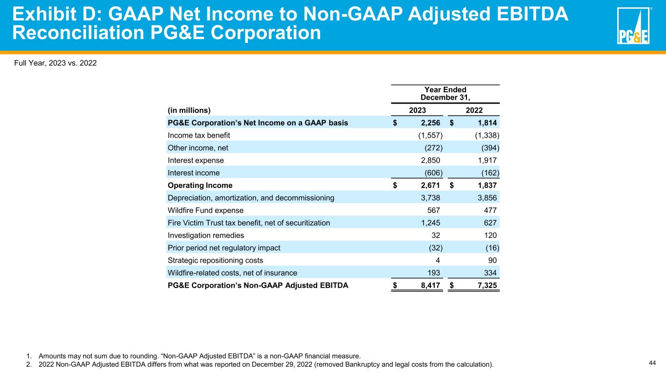 44 Year Ended December 31, (in millions) 2023 2022 PG&E Corporation’s Net Income on a GAAP basis $ 2,256 $ 1,814 Income tax benefit (1,557) (1,338) Other income, net (272) (394) Interest expense 2,850 1,917 Interest income (606) (162) Operating Income $ 2,671 $ 1,837 Depreciation, amortization, and decommissioning 3,738 3,856 Wildfire Fund expense 567 477 Fire Victim Trust tax benefit, net of securitization 1,245 627 Investigation remedies 32 120 Prior period net regulatory impact (32) (16) Strategic repositioning costs 4 90 Wildfire-related costs, net of insurance 193 334 PG&E Corporation’s Non-GAAP Adjusted EBITDA $ 8,417 $ 7,325 Full Year, 2023 vs. 2022 1. Amounts may not sum due to rounding. “Non-GAAP Adjusted EBITDA” is a non-GAAP financial measure. 2. 2022 Non-GAAP Adjusted EBITDA differs from what was reported on December 29, 2022 (removed Bankruptcy and legal costs from the calculation). Exhibit D: GAAP Net Income to Non-GAAP Adjusted EBITDA Reconciliation PG&E Corporation