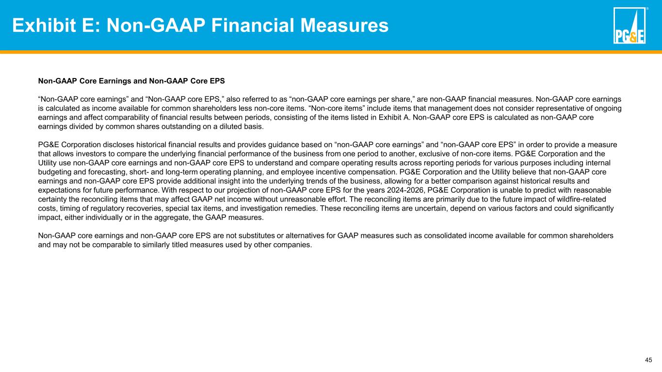 45 Non-GAAP Core Earnings and Non-GAAP Core EPS “Non-GAAP core earnings” and “Non-GAAP core EPS,” also referred to as “non-GAAP core earnings per share,” are non-GAAP financial measures. Non-GAAP core earnings is calculated as income available for common shareholders less non-core items. “Non-core items” include items that management does not consider representative of ongoing earnings and affect comparability of financial results between periods, consisting of the items listed in Exhibit A. Non-GAAP core EPS is calculated as non-GAAP core earnings divided by common shares outstanding on a diluted basis. PG&E Corporation discloses historical financial results and provides guidance based on “non-GAAP core earnings” and “non-GAAP core EPS” in order to provide a measure that allows investors to compare the underlying financial performance of the business from one period to another, exclusive of non-core items. PG&E Corporation and the Utility use non-GAAP core earnings and non-GAAP core EPS to understand and compare operating results across reporting periods for various purposes including internal budgeting and forecasting, short- and long-term operating planning, and employee incentive compensation. PG&E Corporation and the Utility believe that non-GAAP core earnings and non-GAAP core EPS provide additional insight into the underlying trends of the business, allowing for a better comparison against historical results and expectations for future performance. With respect to our projection of non-GAAP core EPS for the years 2024-2026, PG&E Corporation is unable to predict with reasonable certainty the reconciling items that may affect GAAP net income without unreasonable effort. The reconciling items are primarily due to the future impact of wildfire-related costs, timing of regulatory recoveries, special tax items, and investigation remedies. These reconciling items are uncertain, depend on various factors and could significantly impact, either individually or in the aggregate, the GAAP measures. Non-GAAP core earnings and non-GAAP core EPS are not substitutes or alternatives for GAAP measures such as consolidated income available for common shareholders and may not be comparable to similarly titled measures used by other companies. Exhibit E: Non-GAAP Financial Measures