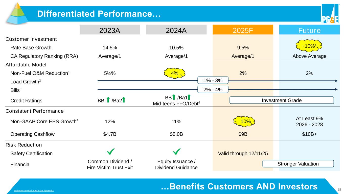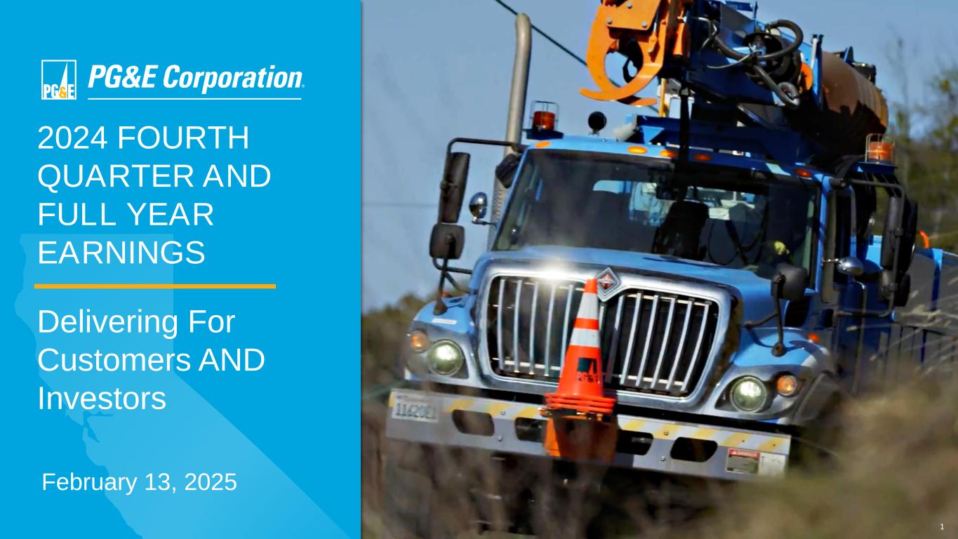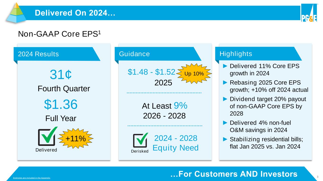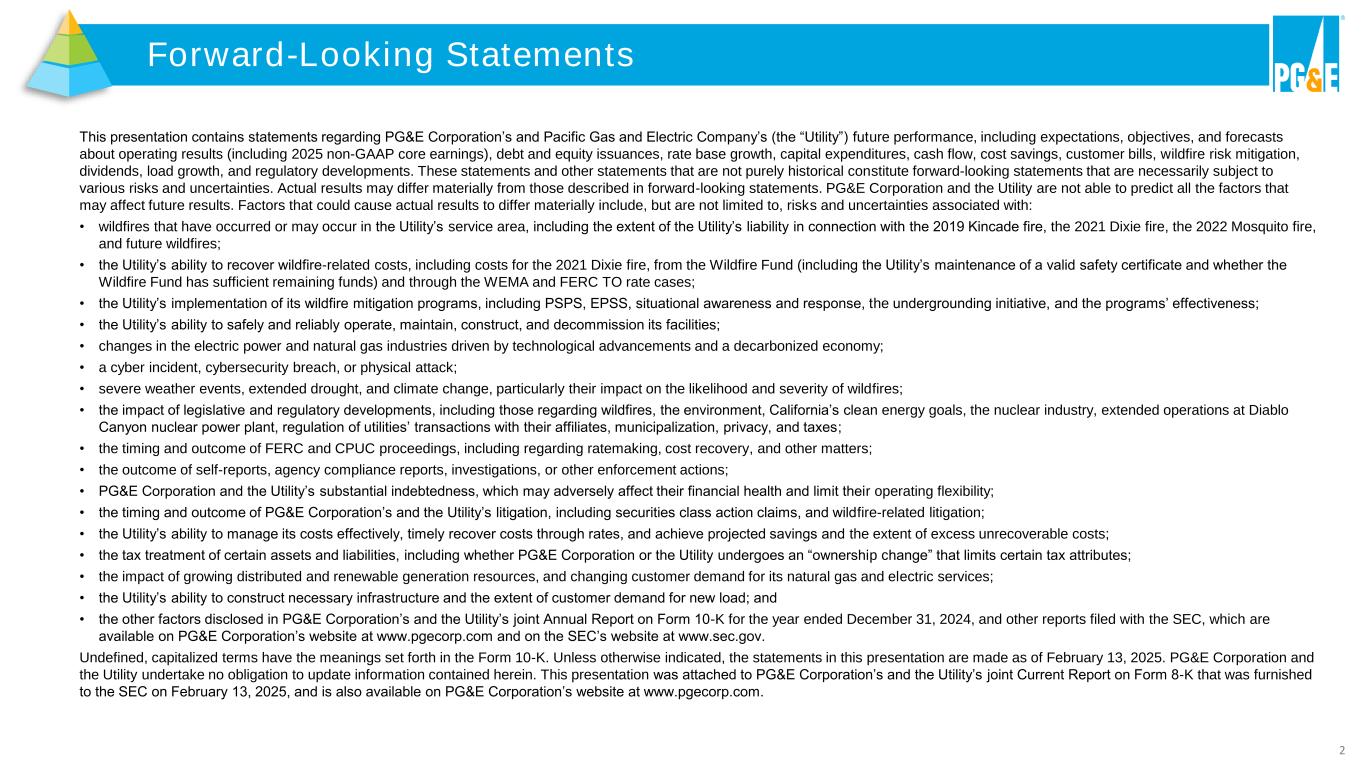 2 This presentation contains statements regarding PG&E Corporation’s and Pacific Gas and Electric Company’s (the “Utility”) future performance, including expectations, objectives, and forecasts about operating results (including 2025 non-GAAP core earnings), debt and equity issuances, rate base growth, capital expenditures, cash flow, cost savings, customer bills, wildfire risk mitigation, dividends, load growth, and regulatory developments. These statements and other statements that are not purely historical constitute forward-looking statements that are necessarily subject to various risks and uncertainties. Actual results may differ materially from those described in forward-looking statements. PG&E Corporation and the Utility are not able to predict all the factors that may affect future results. Factors that could cause actual results to differ materially include, but are not limited to, risks and uncertainties associated with: • wildfires that have occurred or may occur in the Utility’s service area, including the extent of the Utility’s liability in connection with the 2019 Kincade fire, the 2021 Dixie fire, the 2022 Mosquito fire, and future wildfires; • the Utility’s ability to recover wildfire-related costs, including costs for the 2021 Dixie fire, from the Wildfire Fund (including the Utility’s maintenance of a valid safety certificate and whether the Wildfire Fund has sufficient remaining funds) and through the WEMA and FERC TO rate cases; • the Utility’s implementation of its wildfire mitigation programs, including PSPS, EPSS, situational awareness and response, the undergrounding initiative, and the programs’ effectiveness; • the Utility’s ability to safely and reliably operate, maintain, construct, and decommission its facilities; • changes in the electric power and natural gas industries driven by technological advancements and a decarbonized economy; • a cyber incident, cybersecurity breach, or physical attack; • severe weather events, extended drought, and climate change, particularly their impact on the likelihood and severity of wildfires; • the impact of legislative and regulatory developments, including those regarding wildfires, the environment, California’s clean energy goals, the nuclear industry, extended operations at Diablo Canyon nuclear power plant, regulation of utilities’ transactions with their affiliates, municipalization, privacy, and taxes; • the timing and outcome of FERC and CPUC proceedings, including regarding ratemaking, cost recovery, and other matters; • the outcome of self-reports, agency compliance reports, investigations, or other enforcement actions; • PG&E Corporation and the Utility’s substantial indebtedness, which may adversely affect their financial health and limit their operating flexibility; • the timing and outcome of PG&E Corporation’s and the Utility’s litigation, including securities class action claims, and wildfire-related litigation; • the Utility’s ability to manage its costs effectively, timely recover costs through rates, and achieve projected savings and the extent of excess unrecoverable costs; • the tax treatment of certain assets and liabilities, including whether PG&E Corporation or the Utility undergoes an “ownership change” that limits certain tax attributes; • the impact of growing distributed and renewable generation resources, and changing customer demand for its natural gas and electric services; • the Utility’s ability to construct necessary infrastructure and the extent of customer demand for new load; and • the other factors disclosed in PG&E Corporation’s and the Utility’s joint Annual Report on Form 10-K for the year ended December 31, 2024, and other reports filed with the SEC, which are available on PG&E Corporation’s website at www.pgecorp.com and on the SEC’s website at www.sec.gov. Undefined, capitalized terms have the meanings set forth in the Form 10-K. Unless otherwise indicated, the statements in this presentation are made as of February 13, 2025. PG&E Corporation and the Utility undertake no obligation to update information contained herein. This presentation was attached to PG&E Corporation’s and the Utility’s joint Current Report on Form 8-K that was furnished to the SEC on February 13, 2025, and is also available on PG&E Corporation’s website at www.pgecorp.com. Forward-Looking Statements