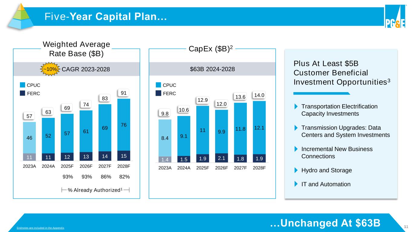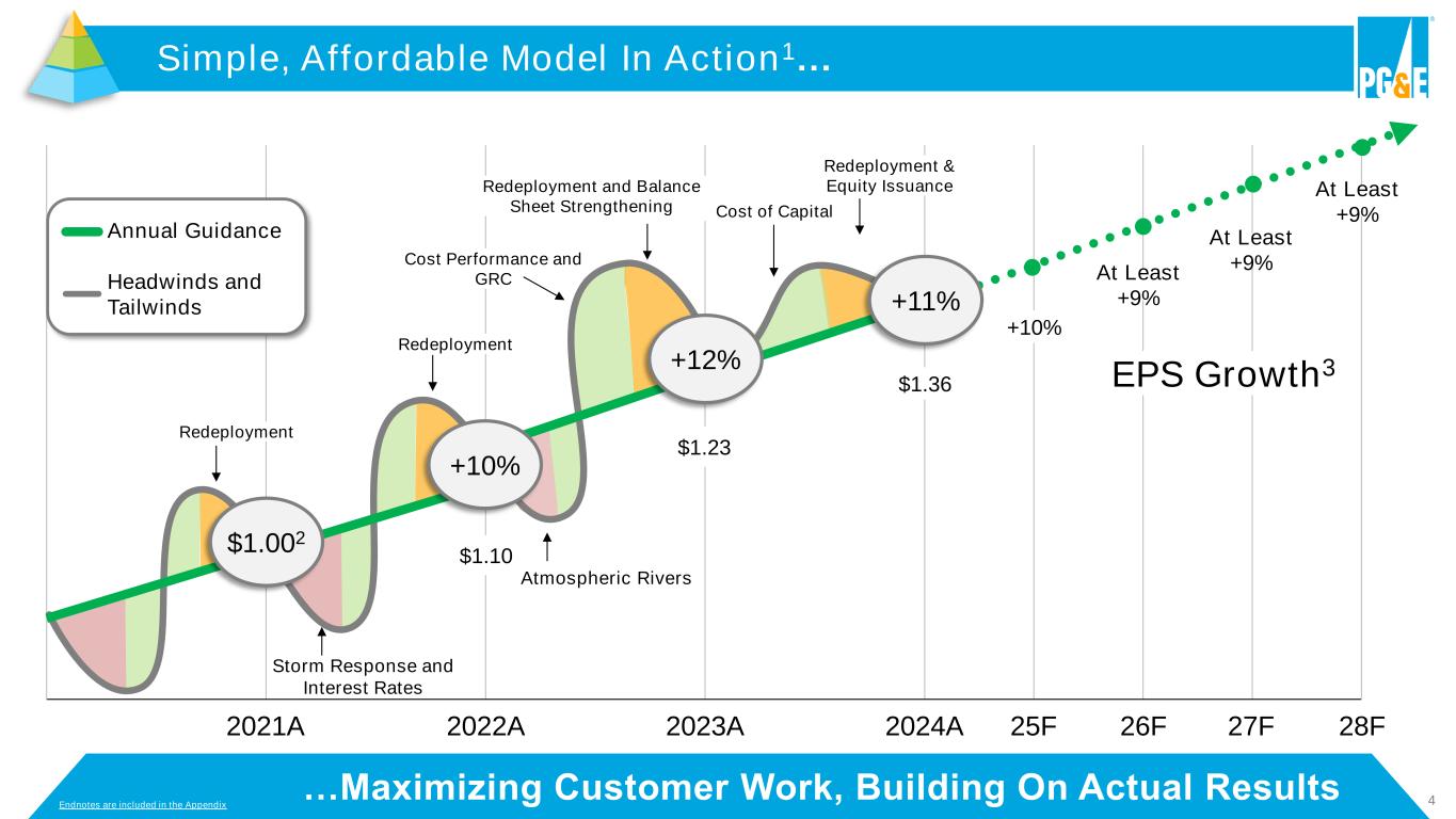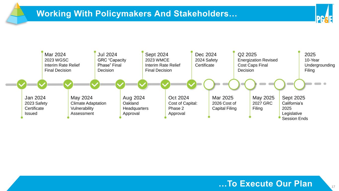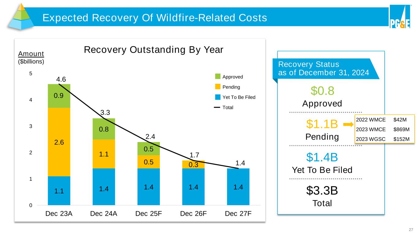 2 This presentation contains statements regarding PG&E Corporation’s and Pacific Gas and Electric Company’s (the “Utility”) future performance, including expectations, objectives, and forecasts about operating results (including 2025 non-GAAP core earnings), debt and equity issuances, rate base growth, capital expenditures, cash flow, cost savings, customer bills, wildfire risk mitigation, dividends, load growth, and regulatory developments. These statements and other statements that are not purely historical constitute forward-looking statements that are necessarily subject to various risks and uncertainties. Actual results may differ materially from those described in forward-looking statements. PG&E Corporation and the Utility are not able to predict all the factors that may affect future results. Factors that could cause actual results to differ materially include, but are not limited to, risks and uncertainties associated with: • wildfires that have occurred or may occur in the Utility’s service area, including the extent of the Utility’s liability in connection with the 2019 Kincade fire, the 2021 Dixie fire, the 2022 Mosquito fire, and future wildfires; • the Utility’s ability to recover wildfire-related costs, including costs for the 2021 Dixie fire, from the Wildfire Fund (including the Utility’s maintenance of a valid safety certificate and whether the Wildfire Fund has sufficient remaining funds) and through the WEMA and FERC TO rate cases; • the Utility’s implementation of its wildfire mitigation programs, including PSPS, EPSS, situational awareness and response, the undergrounding initiative, and the programs’ effectiveness; • the Utility’s ability to safely and reliably operate, maintain, construct, and decommission its facilities; • changes in the electric power and natural gas industries driven by technological advancements and a decarbonized economy; • a cyber incident, cybersecurity breach, or physical attack; • severe weather events, extended drought, and climate change, particularly their impact on the likelihood and severity of wildfires; • the impact of legislative and regulatory developments, including those regarding wildfires, the environment, California’s clean energy goals, the nuclear industry, extended operations at Diablo Canyon nuclear power plant, regulation of utilities’ transactions with their affiliates, municipalization, privacy, and taxes; • the timing and outcome of FERC and CPUC proceedings, including regarding ratemaking, cost recovery, and other matters; • the outcome of self-reports, agency compliance reports, investigations, or other enforcement actions; • PG&E Corporation and the Utility’s substantial indebtedness, which may adversely affect their financial health and limit their operating flexibility; • the timing and outcome of PG&E Corporation’s and the Utility’s litigation, including securities class action claims, and wildfire-related litigation; • the Utility’s ability to manage its costs effectively, timely recover costs through rates, and achieve projected savings and the extent of excess unrecoverable costs; • the tax treatment of certain assets and liabilities, including whether PG&E Corporation or the Utility undergoes an “ownership change” that limits certain tax attributes; • the impact of growing distributed and renewable generation resources, and changing customer demand for its natural gas and electric services; • the Utility’s ability to construct necessary infrastructure and the extent of customer demand for new load; and • the other factors disclosed in PG&E Corporation’s and the Utility’s joint Annual Report on Form 10-K for the year ended December 31, 2024, and other reports filed with the SEC, which are available on PG&E Corporation’s website at www.pgecorp.com and on the SEC’s website at www.sec.gov. Undefined, capitalized terms have the meanings set forth in the Form 10-K. Unless otherwise indicated, the statements in this presentation are made as of February 13, 2025. PG&E Corporation and the Utility undertake no obligation to update information contained herein. This presentation was attached to PG&E Corporation’s and the Utility’s joint Current Report on Form 8-K that was furnished to the SEC on February 13, 2025, and is also available on PG&E Corporation’s website at www.pgecorp.com. Forward-Looking Statements