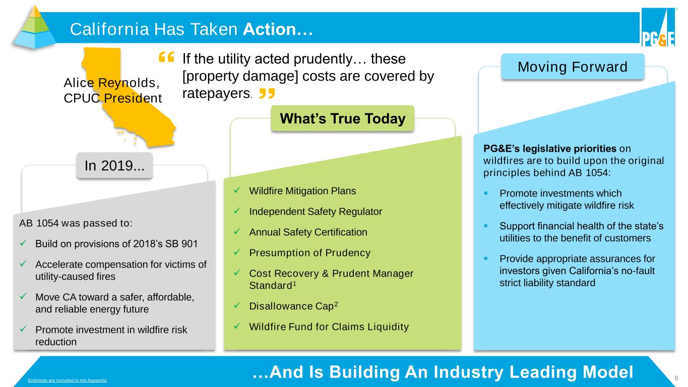 6 California Has Taken Action… …And Is Building An Industry Leading Model In 2019... What’s True Today Moving Forward AB 1054 was passed to: ✓ Build on provisions of 2018’s SB 901 ✓ Accelerate compensation for victims of utility-caused fires ✓ Move CA toward a safer, affordable, and reliable energy future ✓ Promote investment in wildfire risk reduction ✓ Wildfire Mitigation Plans ✓ Independent Safety Regulator ✓ Annual Safety Certification ✓ Presumption of Prudency ✓ Cost Recovery & Prudent Manager Standard1 ✓ Disallowance Cap2 ✓ Wildfire Fund for Claims Liquidity PG&E’s legislative priorities on wildfires are to build upon the original principles behind AB 1054: ▪ Promote investments which effectively mitigate wildfire risk ▪ Support financial health of the state’s utilities to the benefit of customers ▪ Provide appropriate assurances for investors given California’s no-fault strict liability standard Alice Reynolds, CPUC President If the utility acted prudently… these [property damage] costs are covered by ratepayers. Endnotes are included in the Appendix