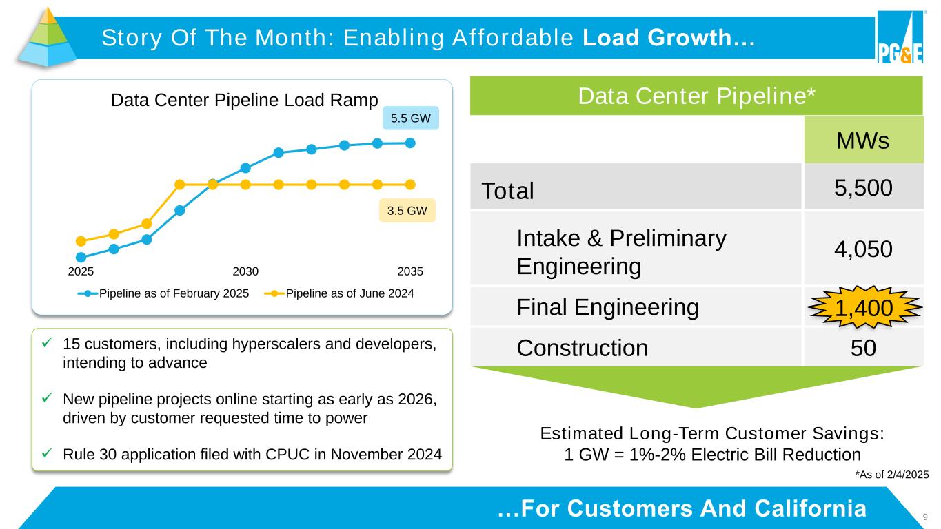 9…For Customers And California Story Of The Month: Enabling Affordable Load Growth… ✓ 15 customers, including hyperscalers and developers, intending to advance ✓ New pipeline projects online starting as early as 2026, driven by customer requested time to power ✓ Rule 30 application filed with CPUC in November 2024 *As of 2/4/2025 MWs Total 5,500 Intake & Preliminary Engineering 4,050 Final Engineering Construction 50 Data Center Pipeline* Estimated Long-Term Customer Savings: 1 GW = 1%-2% Electric Bill Reduction 1,400 2025 2030 2035 Data Center Pipeline Load Ramp Pipeline as of February 2025 Pipeline as of June 2024 5.5 GW 3.5 GW
