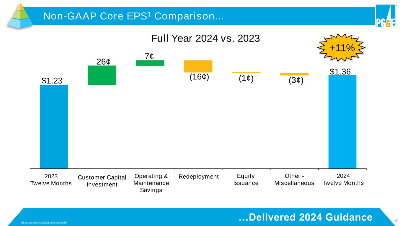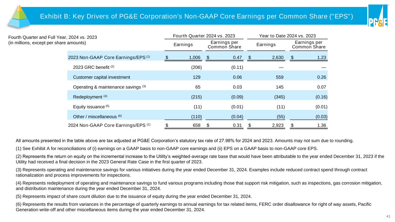 41 All amounts presented in the table above are tax adjusted at PG&E Corporation’s statutory tax rate of 27.98% for 2024 and 2023. Amounts may not sum due to rounding. (1) See Exhibit A for reconciliations of (i) earnings on a GAAP basis to non-GAAP core earnings and (ii) EPS on a GAAP basis to non-GAAP core EPS. (2) Represents the return on equity on the incremental increase to the Utility’s weighted-average rate base that would have been attributable to the year ended December 31, 2023 if the Utility had received a final decision in the 2023 General Rate Case in the first quarter of 2023. (3) Represents operating and maintenance savings for various initiatives during the year ended December 31, 2024. Examples include reduced contract spend through contract rationalization and process improvements for inspections. (4) Represents redeployment of operating and maintenance savings to fund various programs including those that support risk mitigation, such as inspections, gas corrosion mitigation, and distribution maintenance during the year ended December 31, 2024. (5) Represents impact of share count dilution due to the issuance of equity during the year ended December 31, 2024. (6) Represents the results from variances in the percentage of quarterly earnings to annual earnings for tax related items, FERC order disallowance for right of way assets, Pacific Generation write-off and other miscellaneous items during the year ended December 31, 2024. Fourth Quarter 2024 vs. 2023 Year to Date 2024 vs. 2023 Earnings Earnings per Common Share Earnings Earnings per Common Share 2023 Non-GAAP Core Earnings/EPS (1) $ 1,006 $ 0.47 $ 2,630 $ 1.23 2023 GRC benefit (2) (206) (0.11) — — Customer capital investment 129 0.06 559 0.26 Operating & maintenance savings (3) 65 0.03 145 0.07 Redeployment (4) (215) (0.09) (345) (0.16) Equity issuance (5) (11) (0.01) (11) (0.01) Other / miscellaneous (6) (110) (0.04) (55) (0.03) 2024 Non-GAAP Core Earnings/EPS (1) $ 658 $ 0.31 $ 2,923 $ 1.36 Fourth Quarter and Full Year, 2024 vs. 2023 (in millions, except per share amounts) Exhibit B: Key Drivers of PG&E Corporation's Non-GAAP Core Earnings per Common Share ("EPS") Exhibit B: Key Drivers of PG&E Corporation's Non-GAAP Core Earnings per Common Share ("EPS")