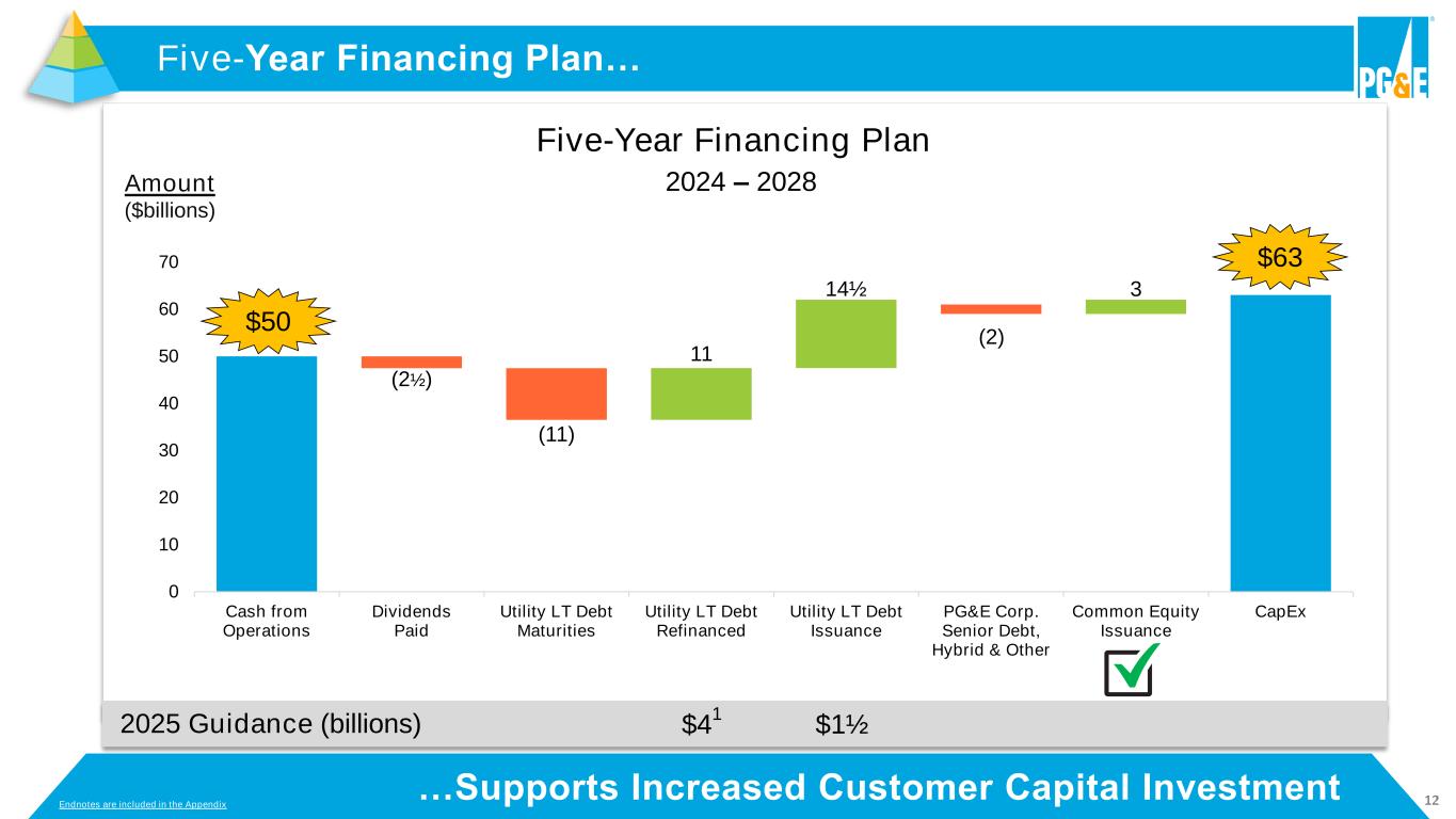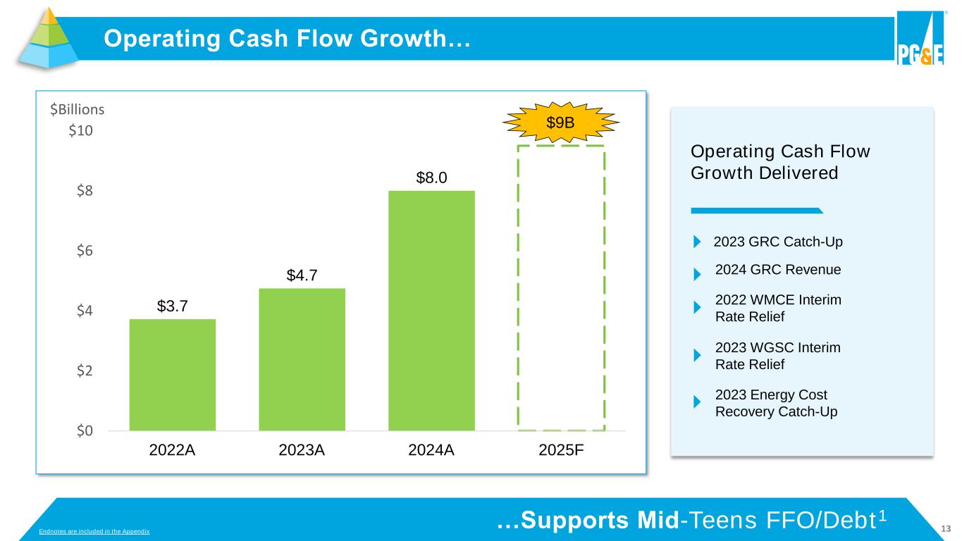 12…Supports Increased Customer Capital Investment Five-Year Financing Plan… (2½) (11) 11 3 0 10 20 30 40 50 60 70 Cash from Operations Dividends Paid Utility LT Debt Maturities Utility LT Debt Refinanced Utility LT Debt Issuance PG&E Corp. Senior Debt, Hybrid & Other Common Equity Issuance CapEx $50 $63 Amount ($billions) 2024 – 2028 Five-Year Financing Plan 14½ (2) Endnotes are included in the Appendix $4 1 $1½ 2025 Guidance (billions)