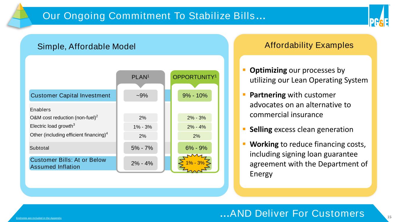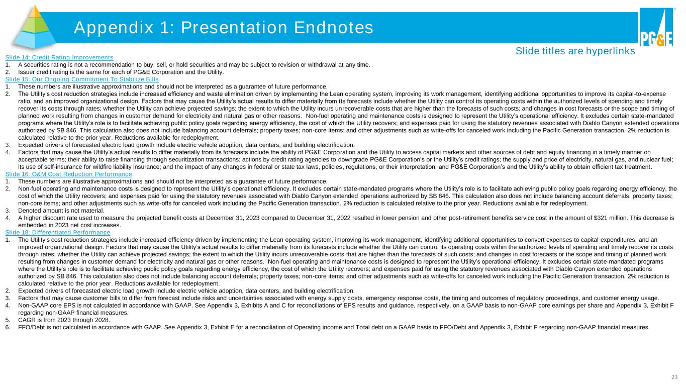 23 Appendix 1: Presentation Endnotes Slide titles are hyperlinks Slide 14: Credit Rating Improvements 1. A securities rating is not a recommendation to buy, sell, or hold securities and may be subject to revision or withdrawal at any time. 2. Issuer credit rating is the same for each of PG&E Corporation and the Utility. Slide 15: Our Ongoing Commitment To Stabilize Bills 1. These numbers are illustrative approximations and should not be interpreted as a guarantee of future performance. 2. The Utility’s cost reduction strategies include increased efficiency and waste elimination driven by implementing the Lean operating system, improving its work management, identifying additional opportunities to improve its capital-to-expense ratio, and an improved organizational design. Factors that may cause the Utility’s actual results to differ materially from i ts forecasts include whether the Utility can control its operating costs within the authorized levels of spending and timely recover its costs through rates; whether the Utility can achieve projected savings; the extent to which the Utility incurs unrecoverable costs that are higher than the forecasts of such costs; and changes in cost forecasts or the scope and timing of planned work resulting from changes in customer demand for electricity and natural gas or other reasons. Non-fuel operating and maintenance costs is designed to represent the Utility’s operational efficiency. It excludes certain state-mandated programs where the Utility’s role is to facilitate achieving public policy goals regarding energy efficiency, the cost of which the Utility recovers; and expenses paid for using the statutory revenues associated with Diablo Canyon extended operations authorized by SB 846. This calculation also does not include balancing account deferrals; property taxes; non-core items; and other adjustments such as write-offs for canceled work including the Pacific Generation transaction. 2% reduction is calculated relative to the prior year. Reductions available for redeployment. 3. Expected drivers of forecasted electric load growth include electric vehicle adoption, data centers, and building electrification. 4. Factors that may cause the Utility’s actual results to differ materially from its forecasts include the ability of PG&E Corporation and the Utility to access capital markets and other sources of debt and equity financing in a timely manner on acceptable terms; their ability to raise financing through securitization transactions; actions by credit rating agencies to downgrade PG&E Corporation’s or the Utility’s credit ratings; the supply and price of electricity, natural gas, and nuclear fuel ; its use of self-insurance for wildfire liability insurance; and the impact of any changes in federal or state tax laws, policies , regulations, or their interpretation, and PG&E Corporation’s and the Utility’s ability to obtain efficient tax treatment. Slide 16: O&M Cost Reduction Performance 1. These numbers are illustrative approximations and should not be interpreted as a guarantee of future performance. 2. Non-fuel operating and maintenance costs is designed to represent the Utility’s operational efficiency. It excludes certain state-mandated programs where the Utility’s role is to facilitate achieving public policy goals regarding energy efficiency, the cost of which the Utility recovers; and expenses paid for using the statutory revenues associated with Diablo Canyon extended operations authorized by SB 846. This calculation also does not include balancing account deferrals; property taxes; non-core items; and other adjustments such as write-offs for canceled work including the Pacific Generation transaction. 2% reduction is calculated relative to the prior year. Reductions available for redeployment. 3. Denoted amount is not material. 4. A higher discount rate used to measure the projected benefit costs at December 31, 2023 compared to December 31, 2022 resulted in lower pension and other post-retirement benefits service cost in the amount of $321 million. This decrease is embedded in 2023 net cost increases. Slide 18: Differentiated Performance 1. The Utility’s cost reduction strategies include increased efficiency driven by implementing the Lean operating system, improving its work management, identifying additional opportunities to convert expenses to capital expenditures, and an improved organizational design. Factors that may cause the Utility’s actual results to differ materially from its forecasts include whether the Utility can control its operating costs within the authorized levels of spending and timely recover its costs through rates; whether the Utility can achieve projected savings; the extent to which the Utility incurs unrecoverable costs that are higher than the forecasts of such costs; and changes in cost forecasts or the scope and timing of planned work resulting from changes in customer demand for electricity and natural gas or other reasons. Non-fuel operating and maintenance costs is designed to represent the Utility’s operational efficiency. It excludes certain state-mandated programs where the Utility’s role is to facilitate achieving public policy goals regarding energy efficiency, the cost of which the Ut ility recovers; and expenses paid for using the statutory revenues associated with Diablo Canyon extended operations authorized by SB 846. This calculation also does not include balancing account deferrals; property taxes; non-core items; and other adjustments such as write-offs for canceled work including the Pacific Generation transaction. 2% reduction is calculated relative to the prior year. Reductions available for redeployment. 2. Expected drivers of forecasted electric load growth include electric vehicle adoption, data centers, and building electrification. 3. Factors that may cause customer bills to differ from forecast include risks and uncertainties associated with energy supp