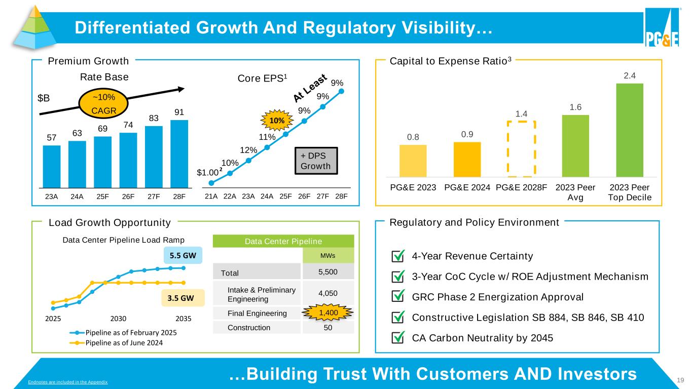 18…Benefits Customers AND Investors Differentiated Performance… Endnotes are included in the Appendix 2023A 2024A 2025F Future Customer Investment Rate Base Growth 14.5% 10.5% 9.5% CA Regulatory Ranking (RRA) Average/1 Average/1 Average/1 Above Average Affordable Model Non-Fuel O&M Reduction1 5½% 4% 2% 2% Load Growth2 Bills3 Credit Ratings BB- /Ba2 BB /Ba1 Mid-teens FFO/Debt6 Consistent Performance Non-GAAP Core EPS Growth4 12% 11% 10% At Least 9% 2026 - 2028 Operating Cashflow $4.7B $8.0B $9B $10B+ Risk Reduction Safety Certification Valid through 12/11/25 Financial Common Dividend / Fire Victim Trust Exit Equity Issuance / Dividend Guidance 1% - 3% 2% - 4% Stronger Valuation 4% ~10%5 Investment Grade 10%
