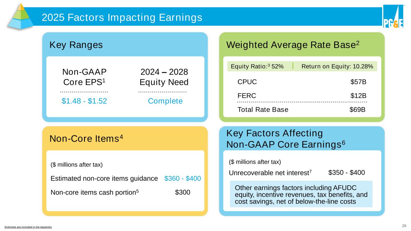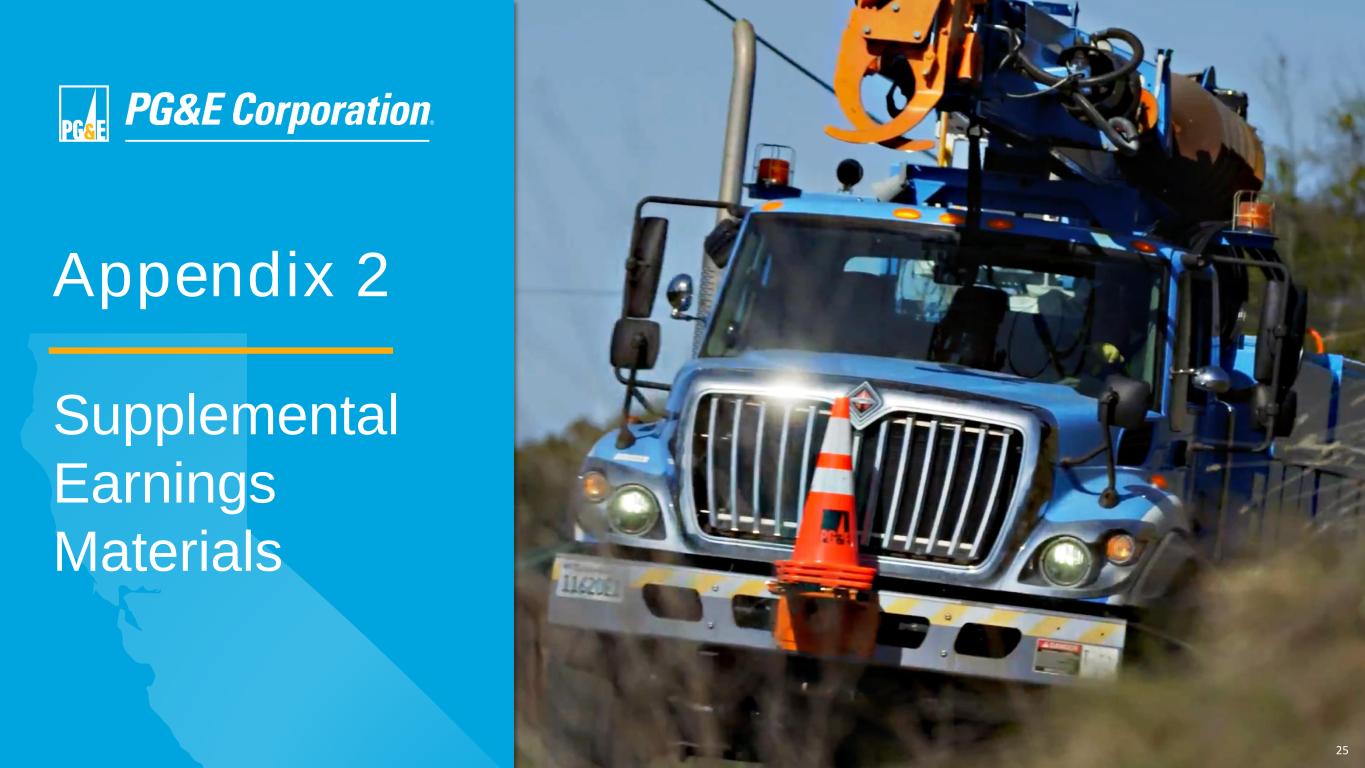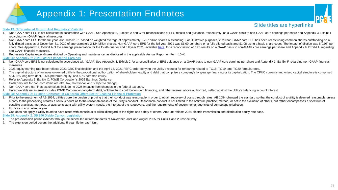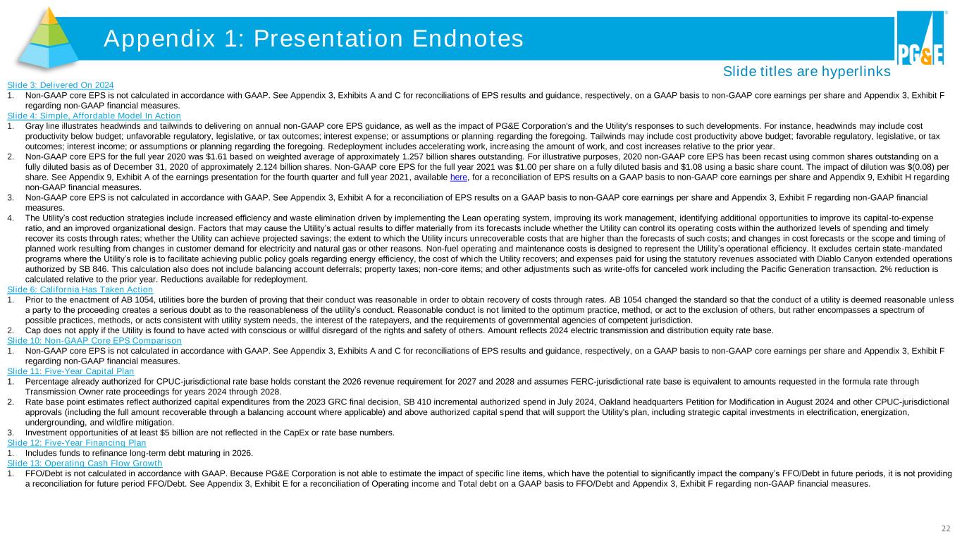 24 Appendix 1: Presentation Endnotes Slide titles are hyperlinks Slide 19: Differentiated Growth And Regulatory Visibility 1. Non-GAAP core EPS is not calculated in accordance with GAAP. See Appendix 3, Exhibits A and C for reconciliations of EPS results and guidance, respectively, on a GAAP basis to non-GAAP core earnings per share and Appendix 3, Exhibit F regarding non-GAAP financial measures. 2. Non-GAAP core EPS for the full year 2020 was $1.61 based on weighted average of approximately 1.257 billion shares outstanding. For illustrative purposes, 2020 non-GAAP core EPS has been recast using common shares outstanding on a fully diluted basis as of December 31, 2020 of approximately 2.124 billion shares. Non-GAAP core EPS for the full year 2021 was $1.00 per share on a fully diluted basis and $1.08 using a basic share count. The impact of dilution was $(0.08) per share. See Appendix 9, Exhibit A of the earnings presentation for the fourth quarter and full year 2021, available here, for a reconciliation of EPS results on a GAAP basis to non-GAAP core earnings per share and Appendix 9, Exhibit H regarding non-GAAP financial measures. 3. Represents Capital expenditures divided by Operating and maintenance, as disclosed in the applicable Annual Report on Form 10-K. Slide 26: Appendix 2: 2025 Factors Impacting Earnings 1. Non-GAAP core EPS is not calculated in accordance with GAAP. See Appendix 3, Exhibit C for a reconciliation of EPS guidance on a GAAP basis to non-GAAP core earnings per share and Appendix 3, Exhibit F regarding non-GAAP financial measures. 2. 2025 equity earning rate base reflects 2023 GRC final decision and the April 15, 2021 FERC order denying the Utility's request for rehearing related to TO18, TO19, and TO20 formula rates. 3. The capital structure of an investor-owned utility is the proportional authorization of shareholders’ equity and debt that comprise a company’s long-range financing or its capitalization. The CPUC currently authorized capital structure is comprised of 47.5% long-term debt, 0.5% preferred equity, and 52% common equity. 4. Refer to Appendix 3, Exhibit C: PG&E Corporation's 2025 Earnings Guidance. 5. Cash amounts for non-core items are after tax, directional, and subject to change. 6. Non-GAAP core earnings assumptions include no 2025 impacts from changes in the federal tax code. 7. Unrecoverable net interest includes PG&E Corporation long-term debt, Wildfire Fund contribution debt financing, and other interest above authorized, netted against the Utility’s balancing account interest. Slide 28: Appendix 2: Existing Construct In California Offers Sector-Leading Financial Protection 1. Prior to the enactment of AB 1054, utilities bore the burden of proving that their conduct was reasonable in order to obtain recovery of costs through rates. AB 1054 changed the standard so that the conduct of a utility is deemed reasonable unless a party to the proceeding creates a serious doubt as to the reasonableness of the utility’s conduct. Reasonable conduct is not limited to the optimum practice, method, or act to the exclusion of others, but rather encompasses a spectrum of possible practices, methods, or acts consistent with utility system needs, the interest of the ratepayers, and the requirements of governmental agencies of competent jurisdiction. 2. For fires in any calendar year. 3. Cap does not apply if Utility found to have acted with conscious or willful disregard of the rights and safety of others. Amount reflects 2024 electric transmission and distribution equity rate base. Slide 29: Appendix 2: SB 846 Diablo Canyon Legislation 1. The pre-extension period extends through the scheduled retirement dates of November 2024 and August 2025 for Units 1 and 2, respectively. 2. The extension period covers the additional 5-year life for each Unit.