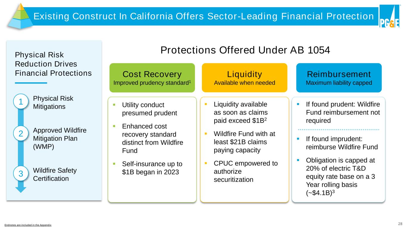 28 Existing Construct In California Offers Sector-Leading Financial Protection Protections Offered Under AB 1054 ▪ Liquidity available as soon as claims paid exceed $1B2 ▪ Wildfire Fund with at least $21B claims paying capacity ▪ CPUC empowered to authorize securitization Liquidity Available when needed ▪ Utility conduct presumed prudent ▪ Enhanced cost recovery standard distinct from Wildfire Fund ▪ Self-insurance up to $1B began in 2023 Cost Recovery Improved prudency standard1 Reimbursement Maximum liability capped ▪ If found prudent: Wildfire Fund reimbursement not required ▪ If found imprudent: reimburse Wildfire Fund ▪ Obligation is capped at 20% of electric T&D equity rate base on a 3 Year rolling basis (~$4.1B)3 Physical Risk Reduction Drives Financial Protections 1 Physical Risk Mitigations 2 Approved Wildfire Mitigation Plan (WMP) 3 Wildfire Safety Certification Endnotes are included in the Appendix